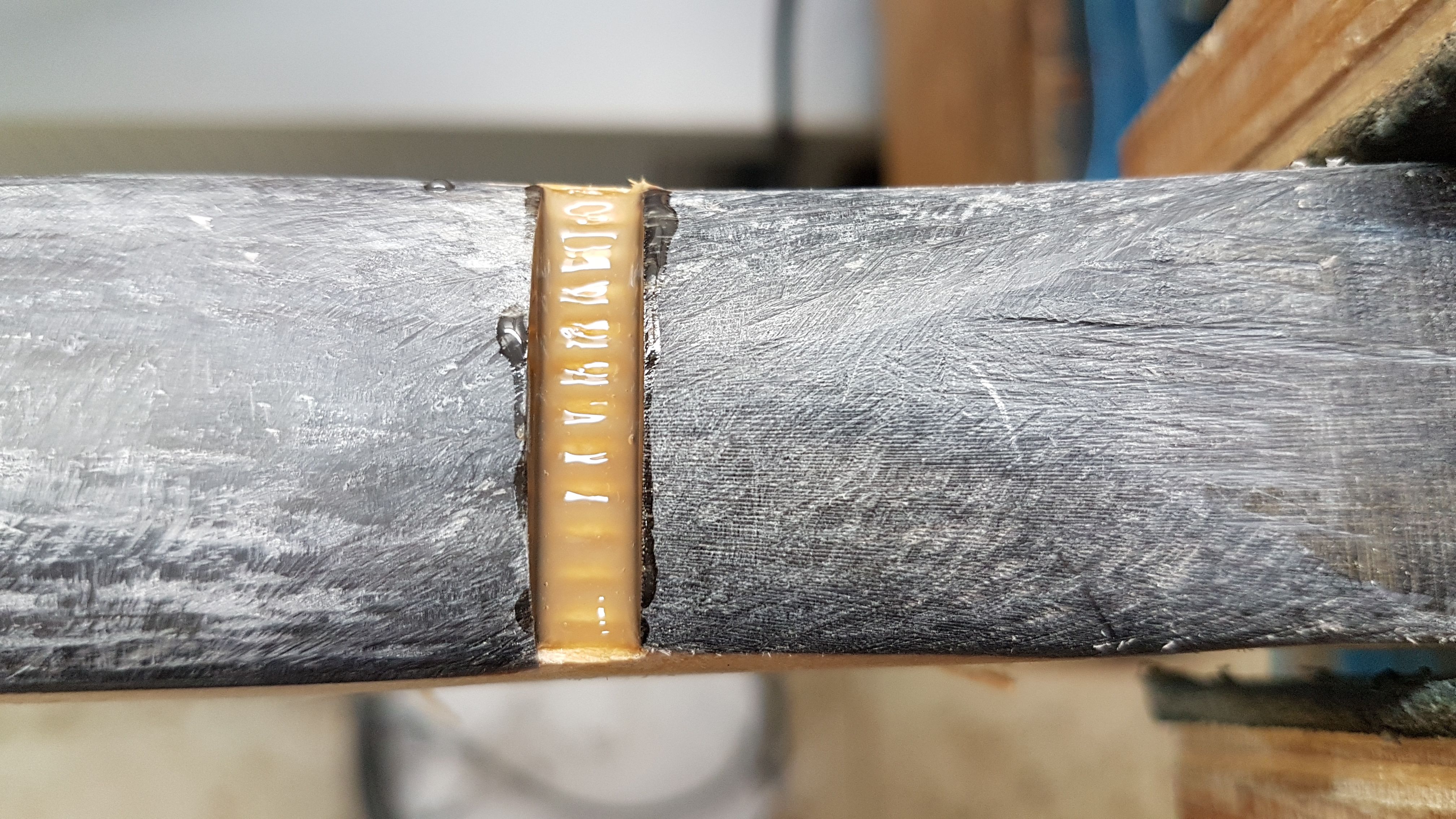 Da ich das Horn noch nicht auf dem entgültigen Dickenmaß habe, habe ich die Kerndicken alle 10 cm gemessen und auf dem Kern festgehalten. So weiß ich nach der Klebeaktion genau wie dick das Horn ist und kann den vorläufigen Dickentaper vor dem Sehnenbelag herstellen.