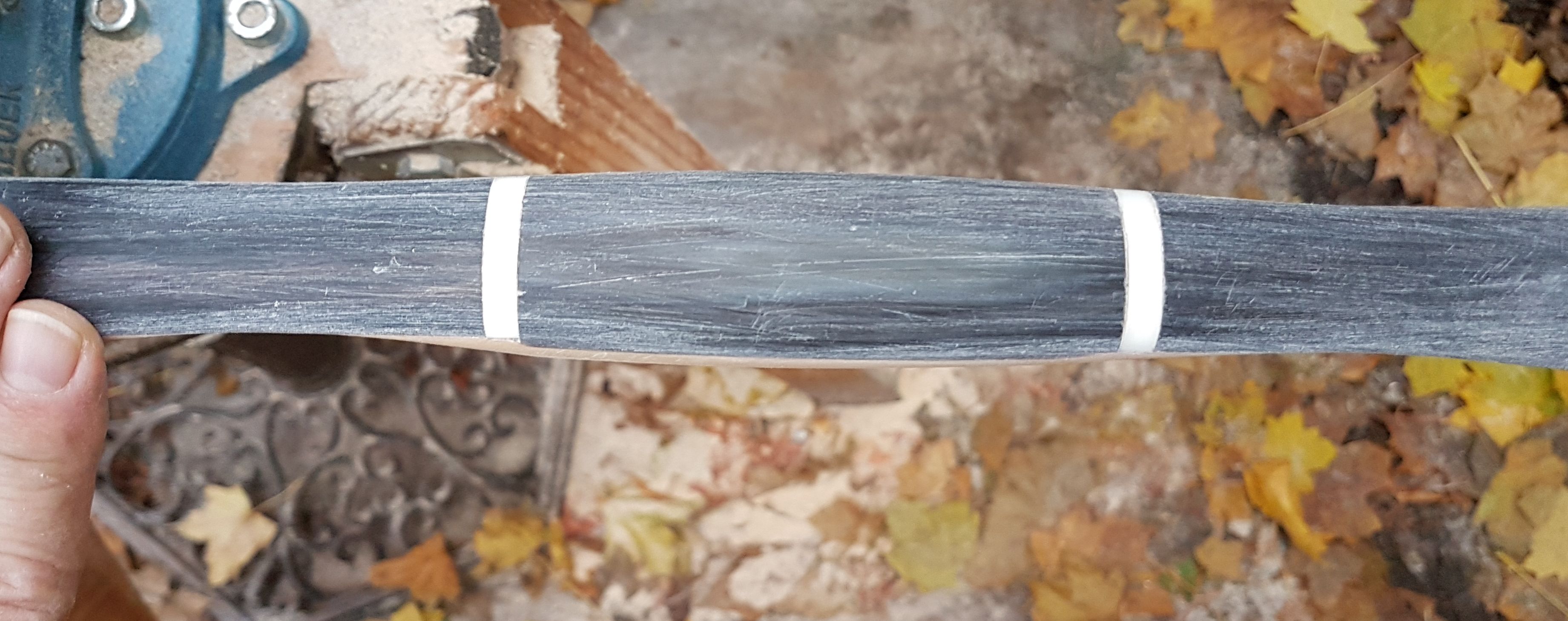 Heute wurde der Griffbereich ausgearbeitet. Da ich morgen sowieso einen Sehnenbelag auf einen anderen Bogen aufbringe, werde ich für den hier dann auch gleich die Fadeouts + 2-3 cm Richtung WA mit Sehne umwickeln.