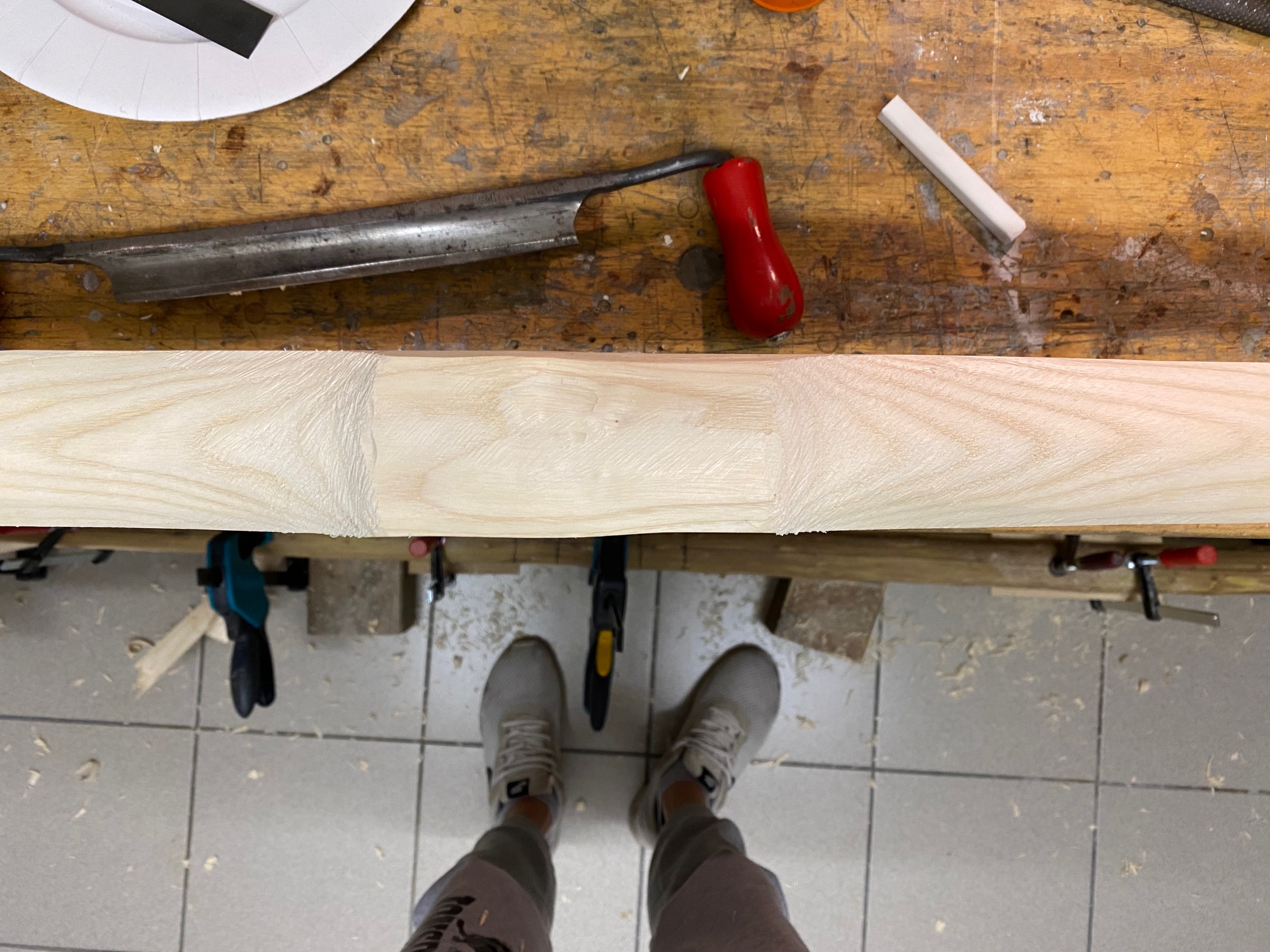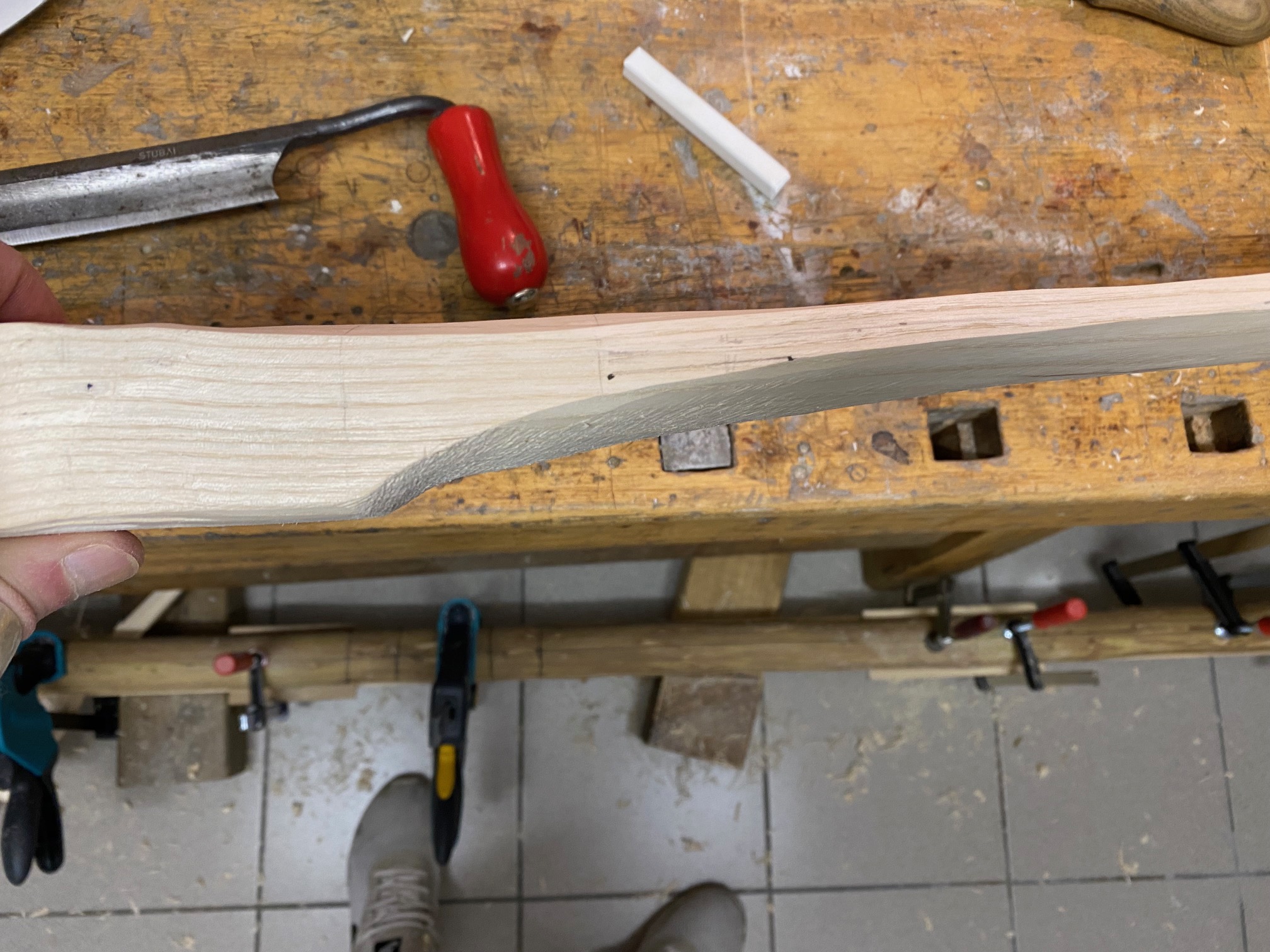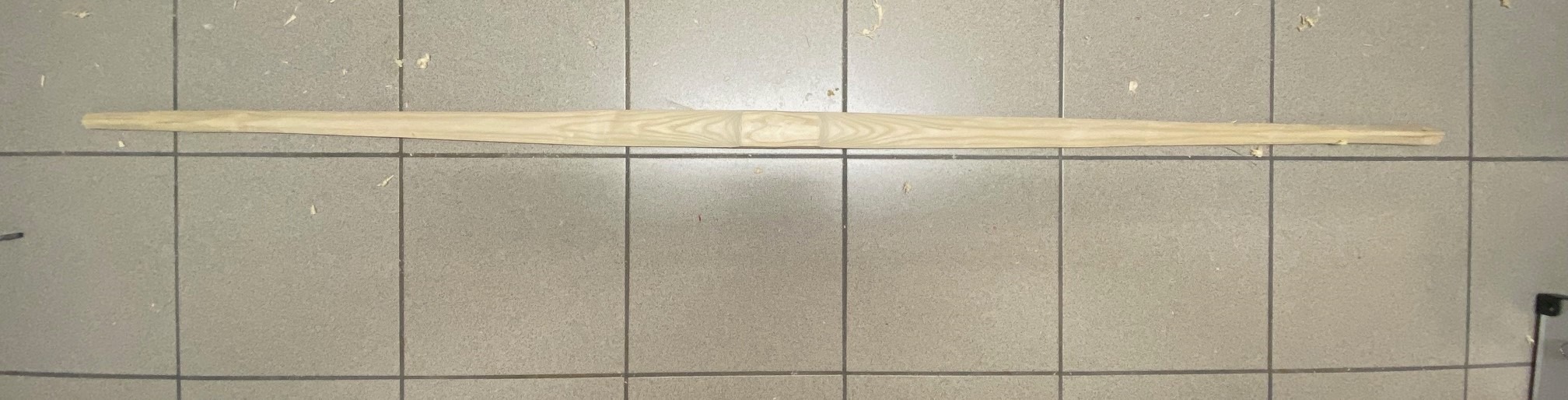 Aktuell arbeite ich mit dem Ziehmesser: vom Griff bis zum markierten Ende (10cm vor WA-Ende). Jeweils links und rechts den Grat abflachen, danach den anderen WA. Prüfen ob Biegung vorhanden, danach erneuter Durchgang. Pro Durchgang auf beiden Seiten verliert das Holz ca 20 gr an Gewicht.
