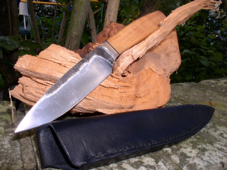 Nun dies ist das fertige Messer aus der zweiten Klinge. Sieht aus wie das erste Klinge (Messer #7) meint Ihr? Stimmt, ich habe die Klinge nach dem gleichen Entwurf geschmiedet nur mit weniger Anleitung von Peter Abel. Das war durchaus Absicht zwengs der Übung.