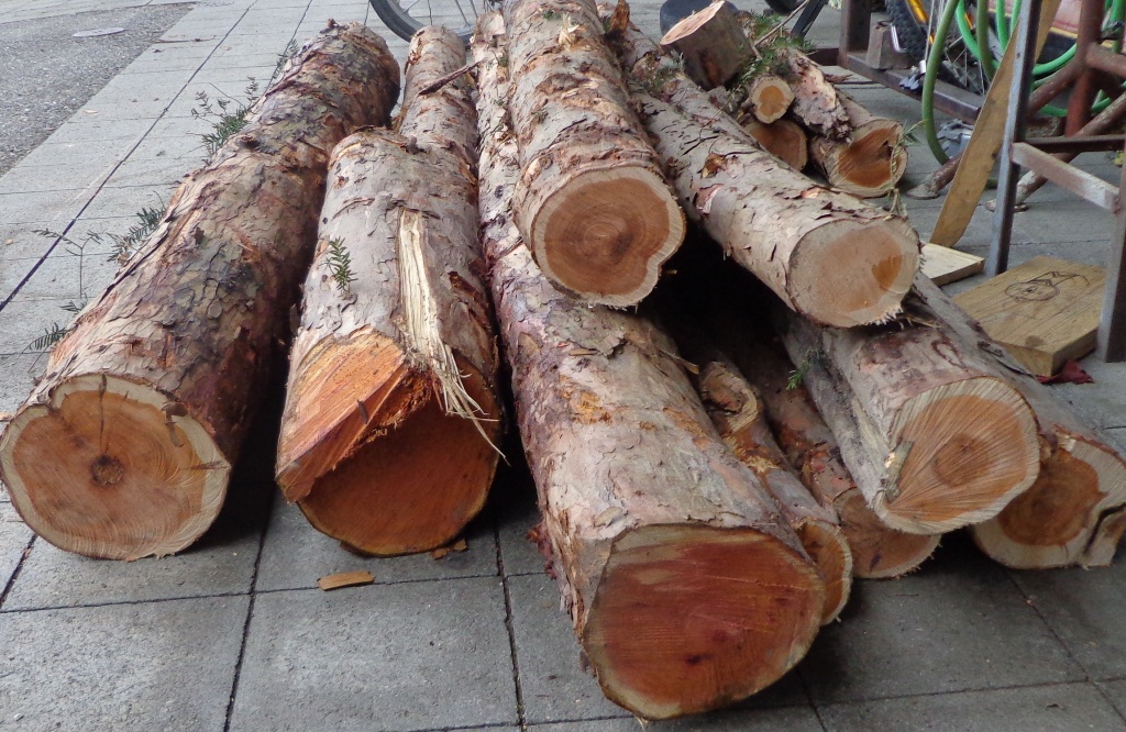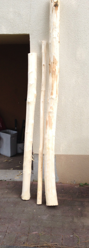 zwei Stämmchen einer 210cm 15cm unten, 12cm oben im Durchmesser (Rinde hab ich schon runter gezogen)