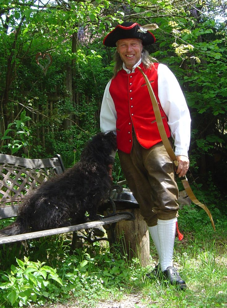 Der Dreispitz, die Form der Weste, die Kniehosen verweisen aufs 18. Jahrhundert (wenn ich mich nit täusch'). Zu der Zeit haben wir dienstlich mit Feuerwaffen geschossen und zum Privatvergnügen Kegel geschoben oder Tarock gespielt. Oder mit Schwarzpulverflinten (vielleicht auch Armbrüsten - keine Ahnung) auf Scheiben geschossen. Alles mögliche.