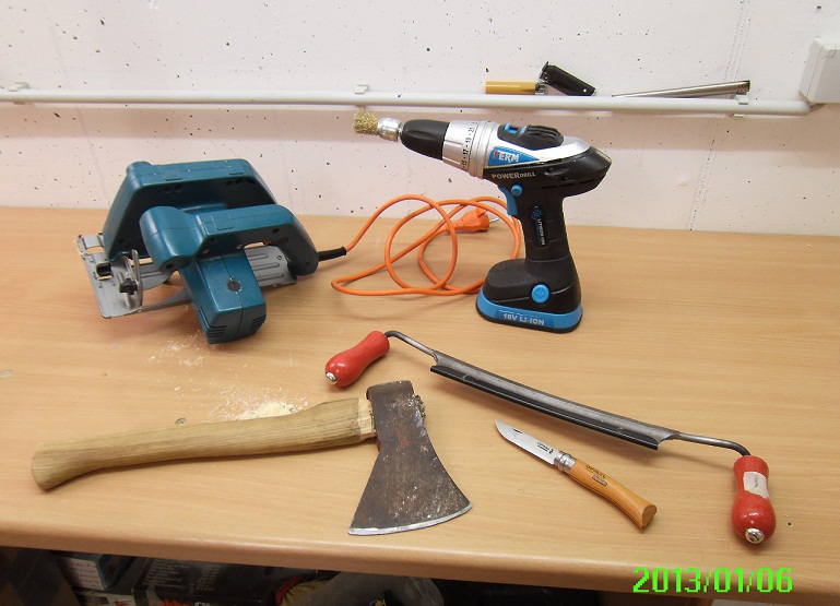 Stave geschält danach mit Axt grob auf Bogenmaß gebracht und mit Schnitzmesser glatt gezogen