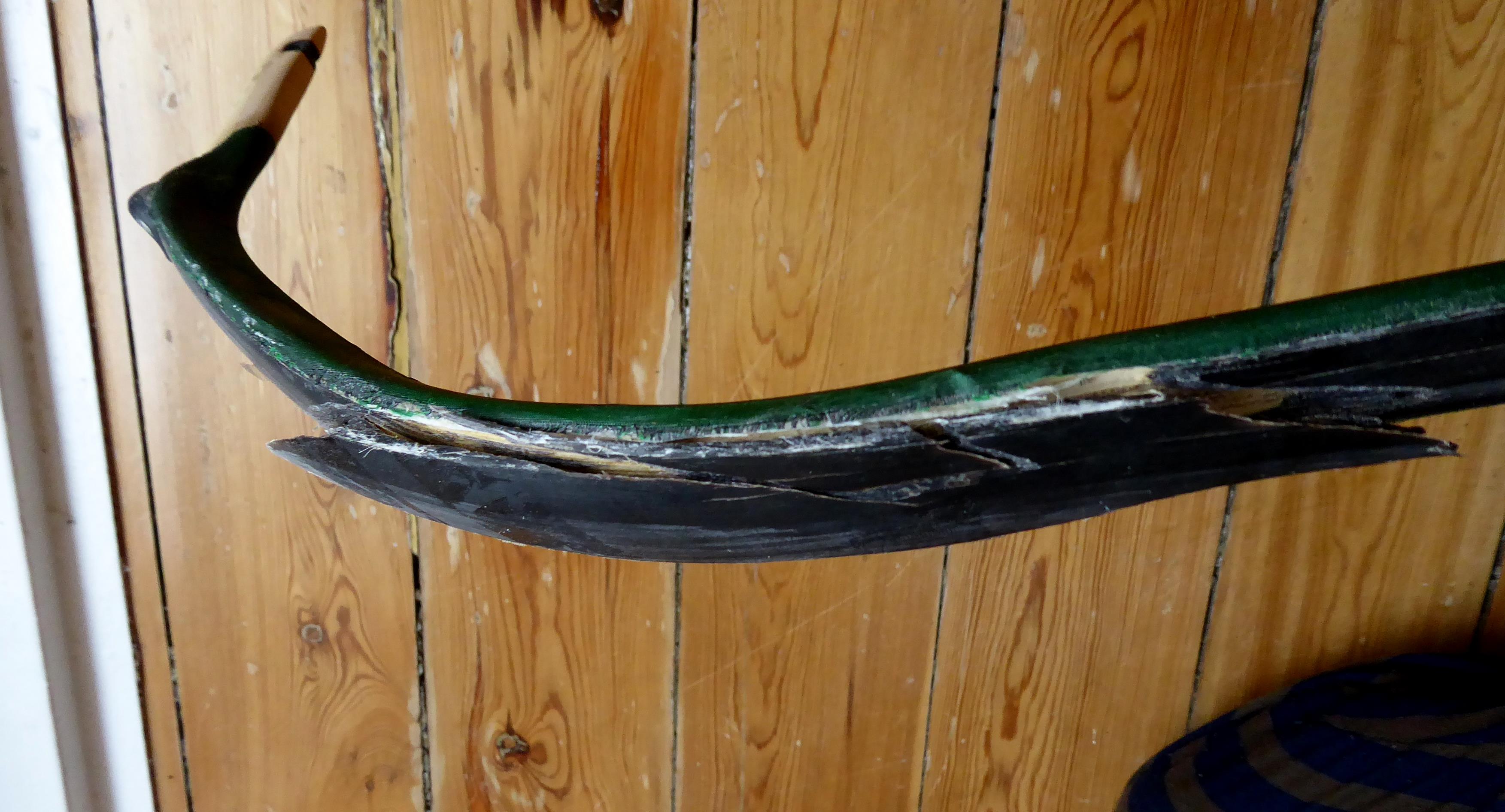 Woran lag es, dass er gebrochen ist? Ich bin mir da nicht sicher. Ein Faktor war sicher die Verdrehung und meine Korrekturversuche. Ein anderer war womöglich das Horn. Ich hab aus den zwei Hörnern noch zwei weitere Streifen herausgeschliffen und probeweise relativ stark belastet, wobei sich das Horn stellenweise als spröde geoutet hat...
