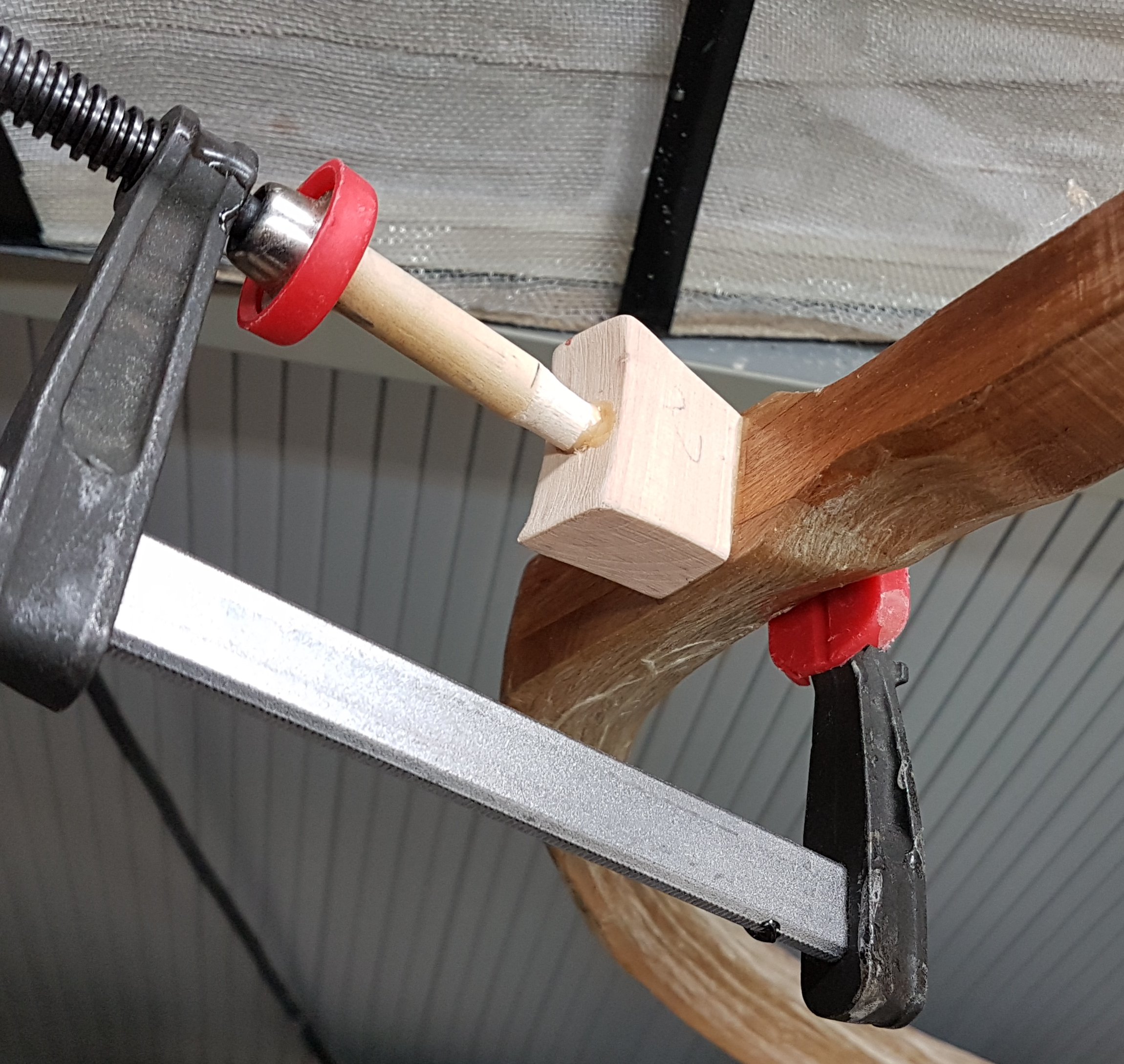 Heute habe ich mal die Sehnenbänke aufgeklebt und da die gerne mal abbrechen, wurde mit Dübeln zusätzlich befestigt. Fertige Dübel hatte ich keine, aber noch verschiedene 10 mm Stangen. Also habe ich passende Stücke auf 8 mm Durchm. geschliffen (ist Ahorn). Ich hätte natürlich auch gleich 10 mm Löcher bohren können, war mir aber zu groß. Geklebt habe ich mit Fisch-Kaltleim.