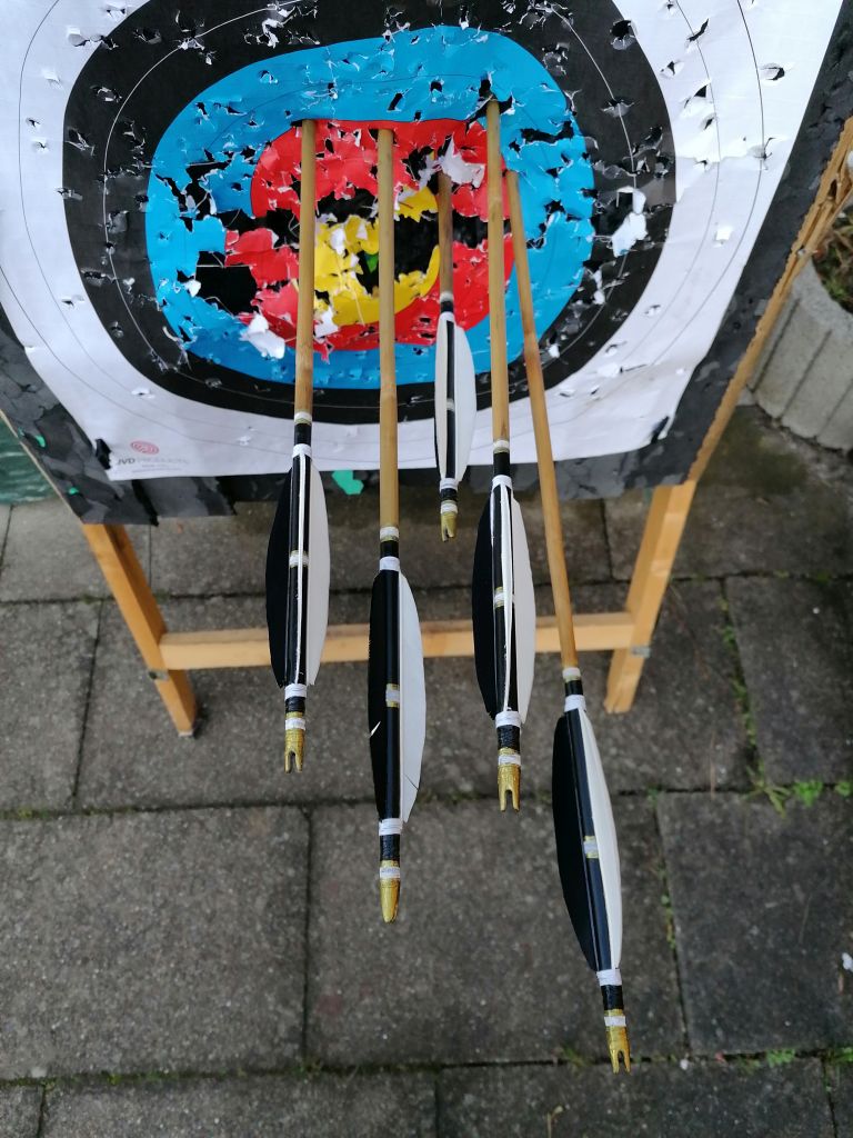 Der normale Satz mit den selbst geschmiedeten Pfeilspitzen.... da stecken bis auf ein Pfeil alle gerade.