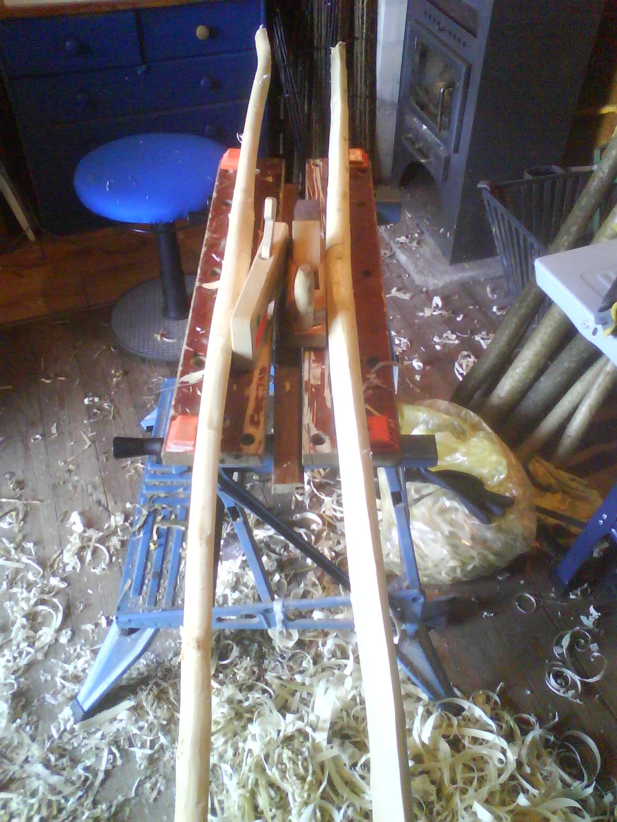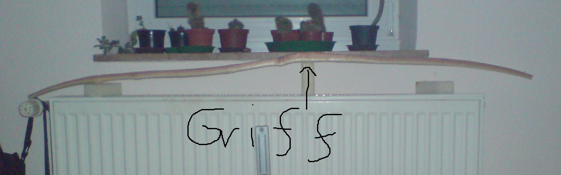 Beim trocknen hat sich der obere Wurfarm auf den letzten ca 20cm etwas zur Seite gedreht aber des werd ich durch Kochen beheben wollen. Aber zuerst will ich testen wie gut sich Faulbaum biegen lässt (hab noch einen kleinen Versuchsstave hier)