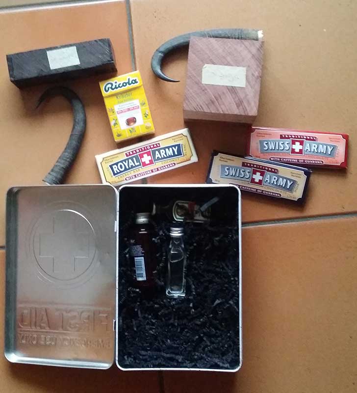 So ihr lieben Leute, ich habe mich sehr über mein Wichtelgeschenk gefreut. Edelhölzer, Horn, schweizer Armeeschokolade, etwas flüssiges zur besseren Verdauung