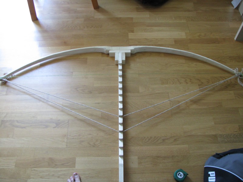Tipp: die Sehnen aller meiner Bögen sind zwischen 6,8 und 7,2cm kürzer als das Maß von Sehnenkerbe zu Sehnenkerbe.