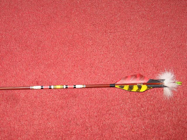 Schäfte: Gold Tip Traditionell 600, mit 70 grain Spitze und 4" Saubuckelbefiederung und Tacer aus Kaninchenfell selbst gefärbt.(würde ich nicht mehr machen - sowas gibt es im Anglerbedarf recht günstig super gefärbt zu kaufen) Länge 75,5 cm.