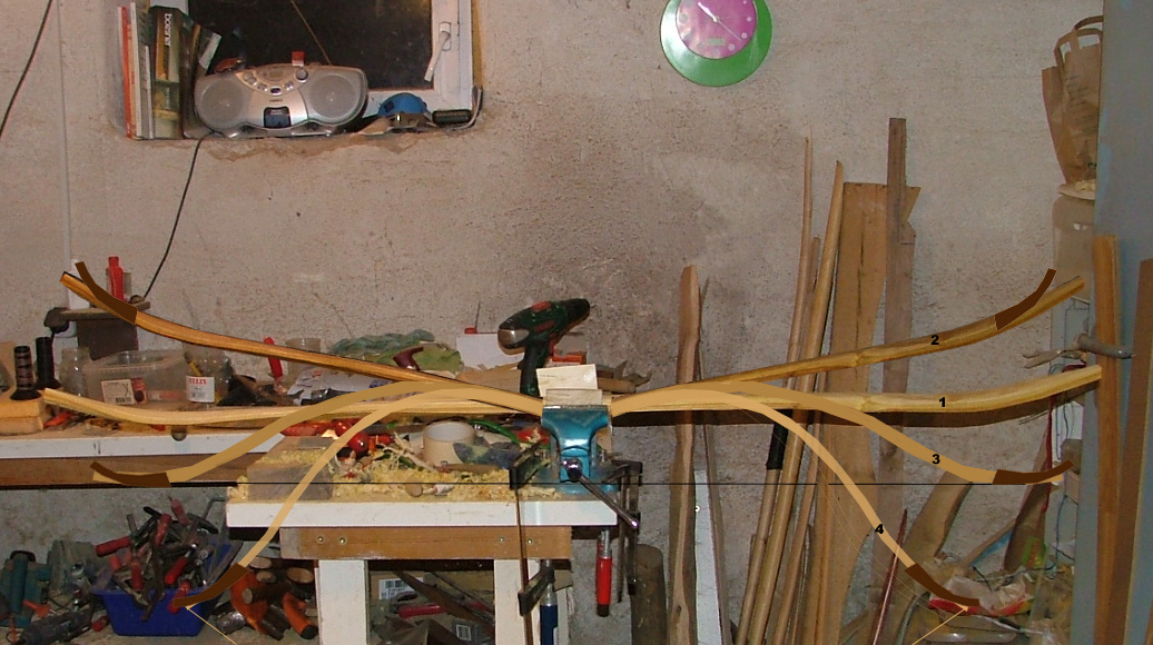 Da ich sowieso eine Seitenkorrektur im Griff durchführen muss werd ich da auch noch einen deutlichen Reflex einbiegen und den Bogen mit Setback im Griff bauen. Ziel ist eine Schwalbenform. Mittels des Sehnenbackings hoffe ich die engen Biegeradien die sich aus diesem Design ergeben realisieren zu können.