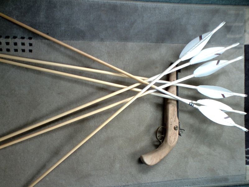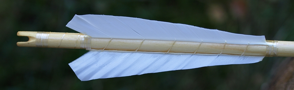 Der zweite Satz ist für einen Vereinskollegen, der eine dunkle Wicklung haben wollte. Da die Federn aus dem hinteren Teil der Originalfeder sind und dadurch hinten sehr schmal werden, mußte ich eine andere Federform wählen. Die Schäfte sind auf 30" abgelängt und das Spitzengewicht sind 125 grn.
