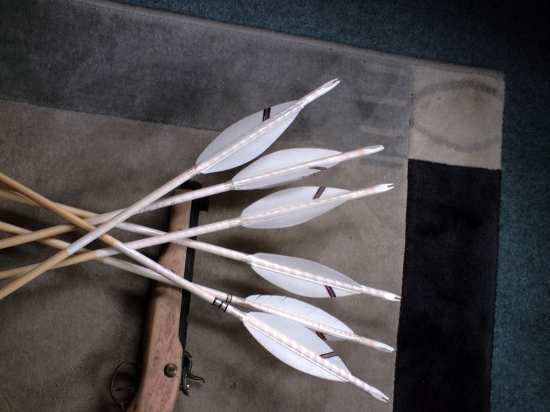 Ich stelle heute zwei Pfeilsätze vor, beide aus 11/32 Kiefernschäften (40-45# Spine) mit Feldspitzen und Gänsefedern aus der vollen Feder selbst geschnitten (freihand).