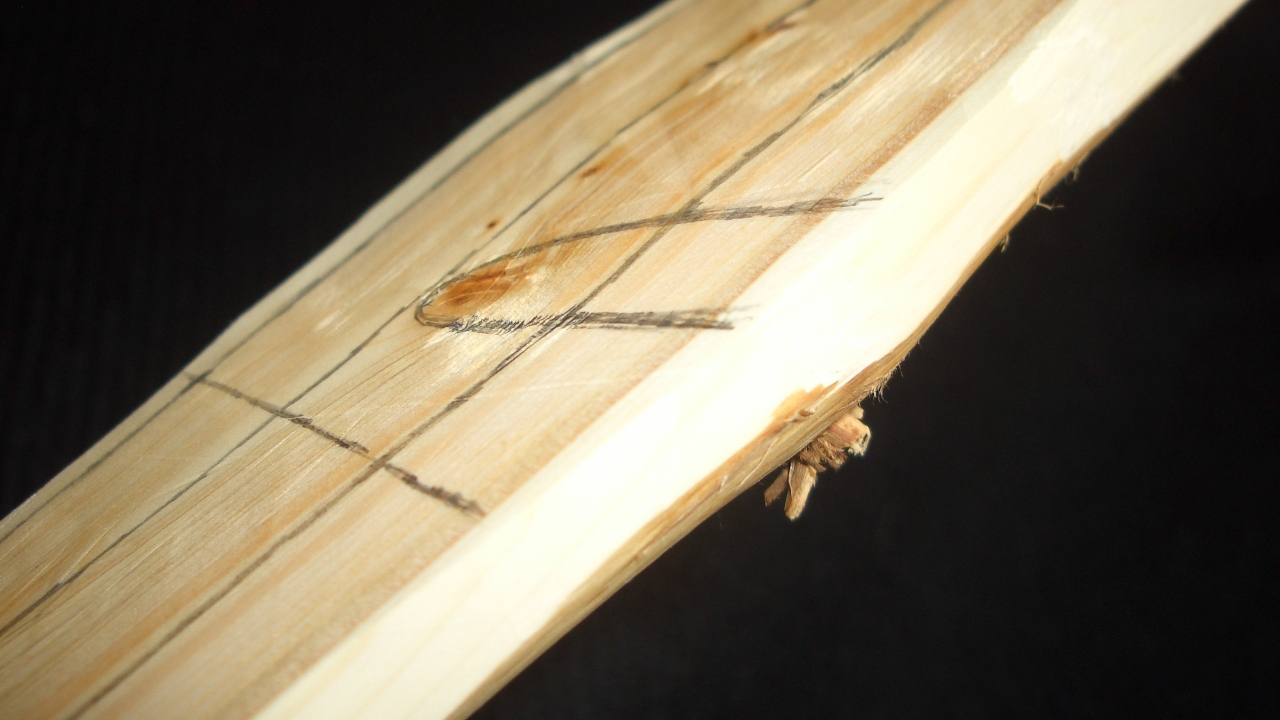 Ich würde zuerst eine Mittellinie anhand der Faserverlauf anzeichnen, mit einem Schnur kontrollieren ob der Sehnenverlauf in etwa passt, Konturen anzeichen und gleich mal etwas Späne fliegen lassen