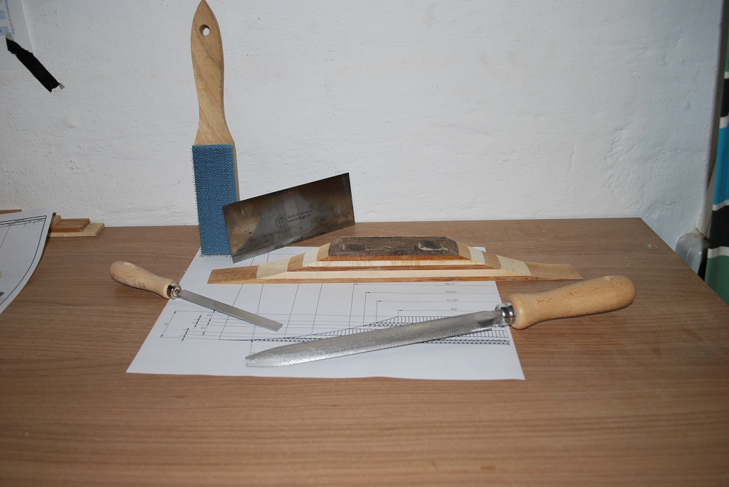 Nun bin ich doch ein wenig traurig den Bandsägen Pfusch nicht auf Zelluloid oder ähnlichem gebannt zu haben. Bin heute mit meinen neuen, unbeschreiblich geilen (nicht anders zu formulieren sry), Raspeln rüber. Ganz ohne Spindelschleifer o.ä.- noch n bisschen mit der Ziehklinge. Die Mitte macht noch einen leichten Bauch, der Radius ertastet sich recht harmonisch und die Enden sind auf die "Papierdicke" von 0,5mm gebracht worden.