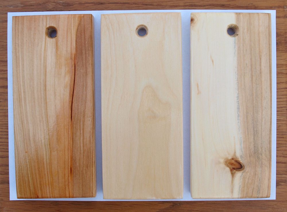Hier noch ein Bild mit dem angefeuerten Holz. Damit man die Brettchen auch benutzen kann, habe ich dafür reines Olivenöl verwendet. Dies mag manche Leute eher verwirren, denn relativ farblose Hölzer werden so leicht zu einer echten Augenweide (s. Probe links). Fast weiße Hölzer bekommen plötzlich einen Braunstich. Aber man sieht die Maserung besser.