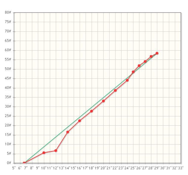 langsam verstehe ich Deine Bögen. Es geht um Radien: Biegeradius zu Dicke. Das Ganze reizt Du bis nahe dem maximalen Sehnenwinkel aus. Übrigens sehr gleichmäßiger und schöner Tiller. Die Auszugskurve ist schön linear. Allerdings - wo kommt die Delle im unteren Bereich her? Set?