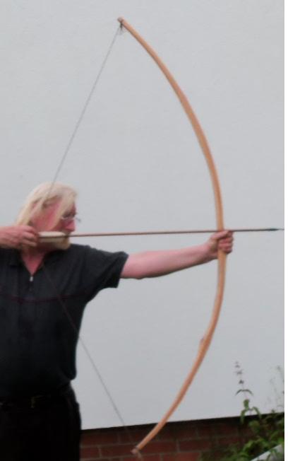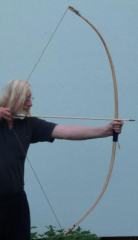 Entspannt, der Stave ist leicht deflex: Standhöhe Und bei ~26" Irgend wie geht wegen des Astes elegant anders. Der Bogen ist 190 cm lang, geschossen mit 32 " hat er doch rums, kein zusätzlicher Set. Allerdings ist die Rinde noch teilweise drauf, platzt nicht ab.