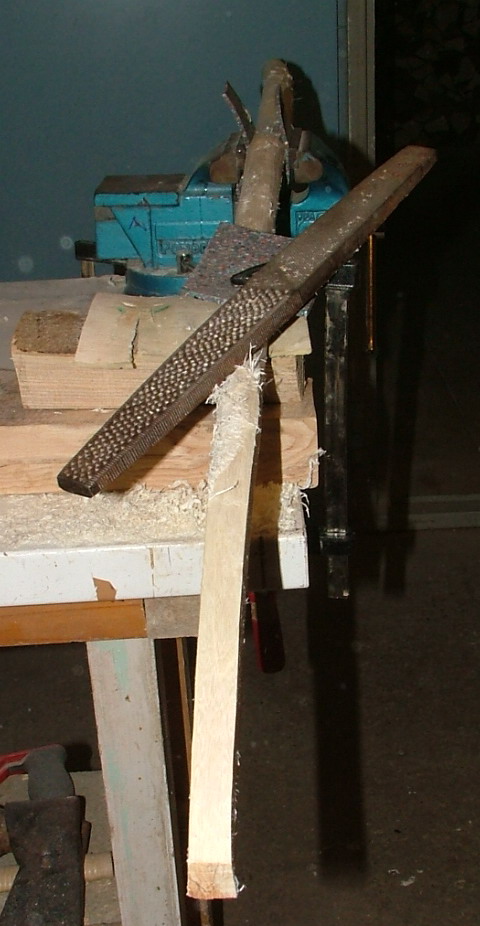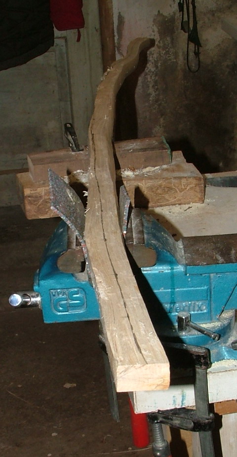 Das Verrunden hab ich mit der Hufraspel durchgeführt nachdem Ulme in nassem Zustand extrem fasert und ein Teil der Fasern bei Ulme bekanntlich kreuz und quer verläuft. Nach der Hufraspel sieht das Holz aus wie ein Igel und wurde deshalb mit der Ziehklinge abgezogen.