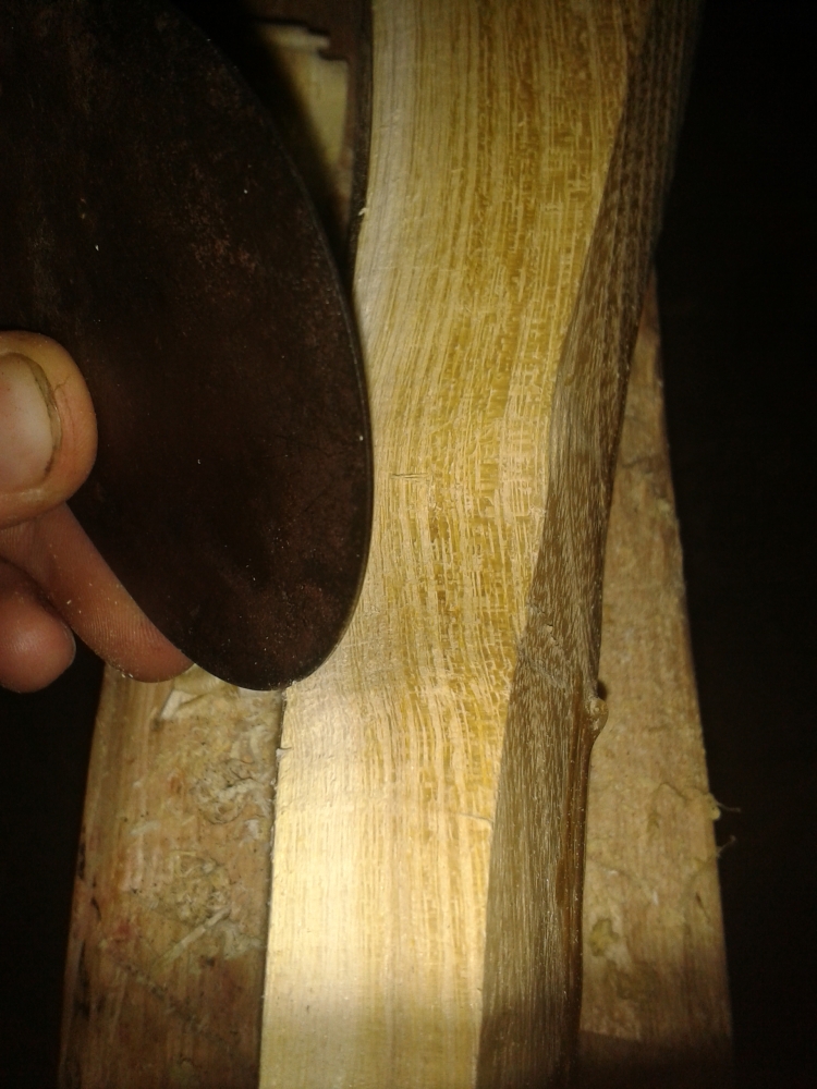 Erstmal die Raspelspuren wieder mit der Ziehklinge entfernen: Dann mal den Griff nach meinem altbewährten Prinzip ausarbeiten: Was dabei rauskam, sah dann so aus: Als nächstes steht dann wohl Rückenring freilegen an;das wird aber vielleich erst in einer Woche geschehen, mal schauen, wie feucht das Holz innendrin noch ist. Vom Gefühl her würd ich sagen, so 15-18%.