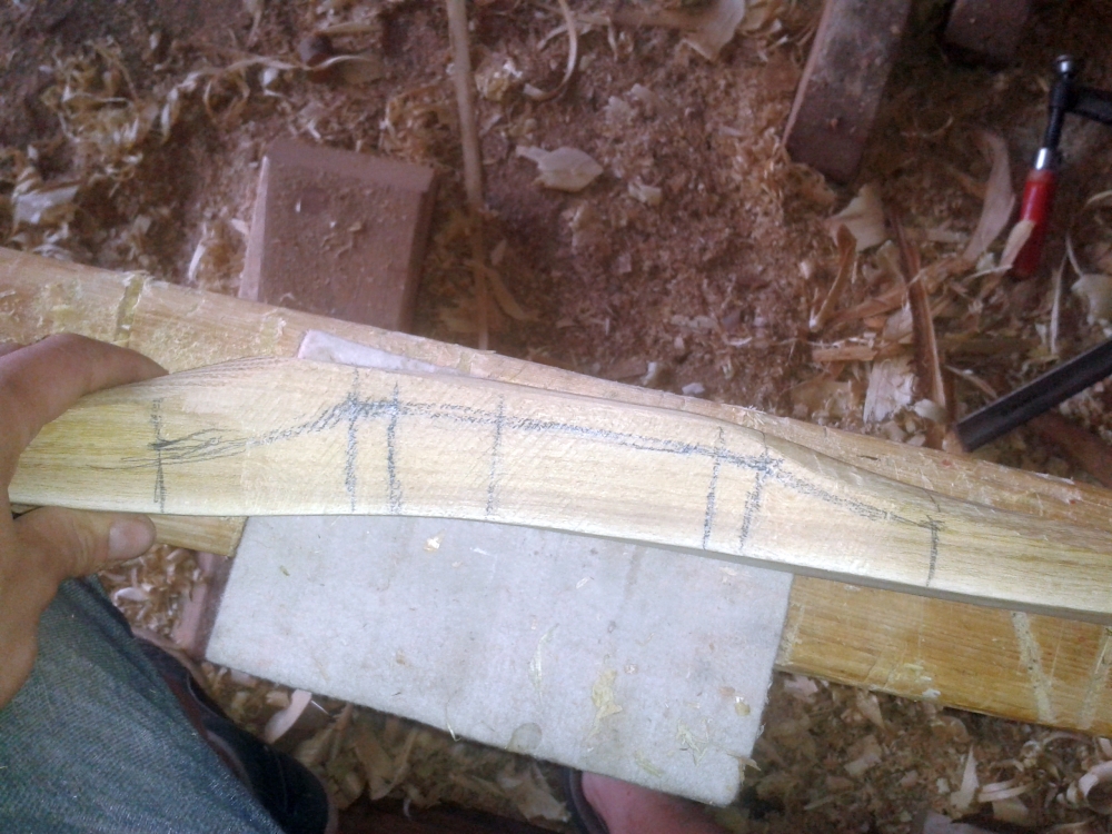Erstmal die Dicke auf ein vernünftiges Maß bringen: Schaut ganz gut aus: Dann schonmal den Griff anzeichnen und ausschneiden(3cm+5cm Fades, Dickenreduktion beginnt erst nach Beginn der Breitenzunahme!): Ich werde ihn auch noch runden, technisch gesehen unnötig, aber ich mags, wenn es während dem Tillern schon nach Bogen aussieht