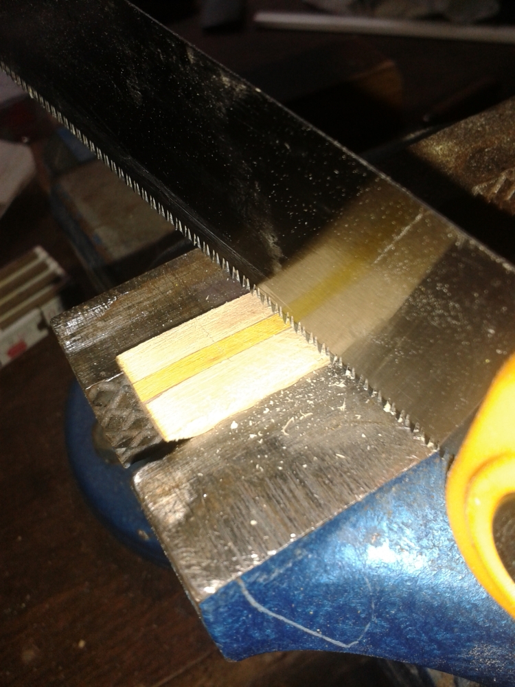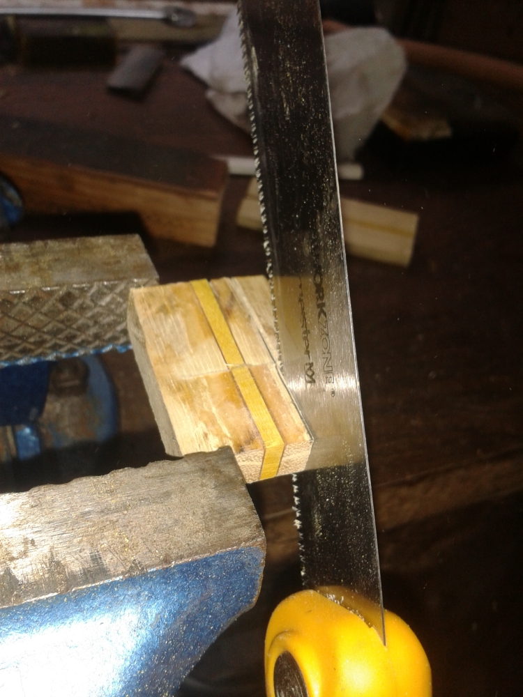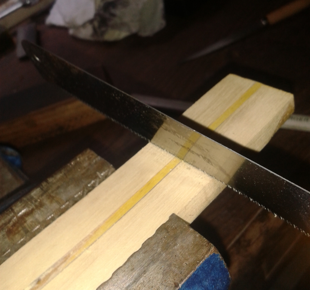 Erstmal schleife ich die Grundseite plan und berfreie sie von Kleberresten: Dauraufhin schneide ich zwei 5cm-Stücke ab: Dann schneide ich oben die überstehende Berberitze weg: Als nächstes werden die Seiten noch verschmälert, schließlich ist das gute Stück mit 2,3cm noch viiiel zu breit: Dann raue ich mit der Säge noch leicht die spätere Klebefläche auf: Zu guter letzt noch die Kante abschrägen, dann spare ich mir später ein wenig Arbeit mit der Raspel: Geklebt wird erst heute Abend, so dass ich den Mittag noch am Bogen weitermachen kann und der Kleber dann wieder über Nacht aushärtet.