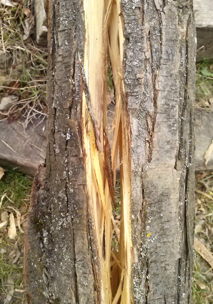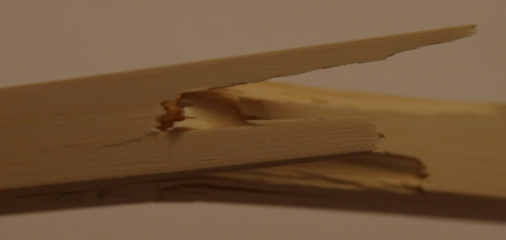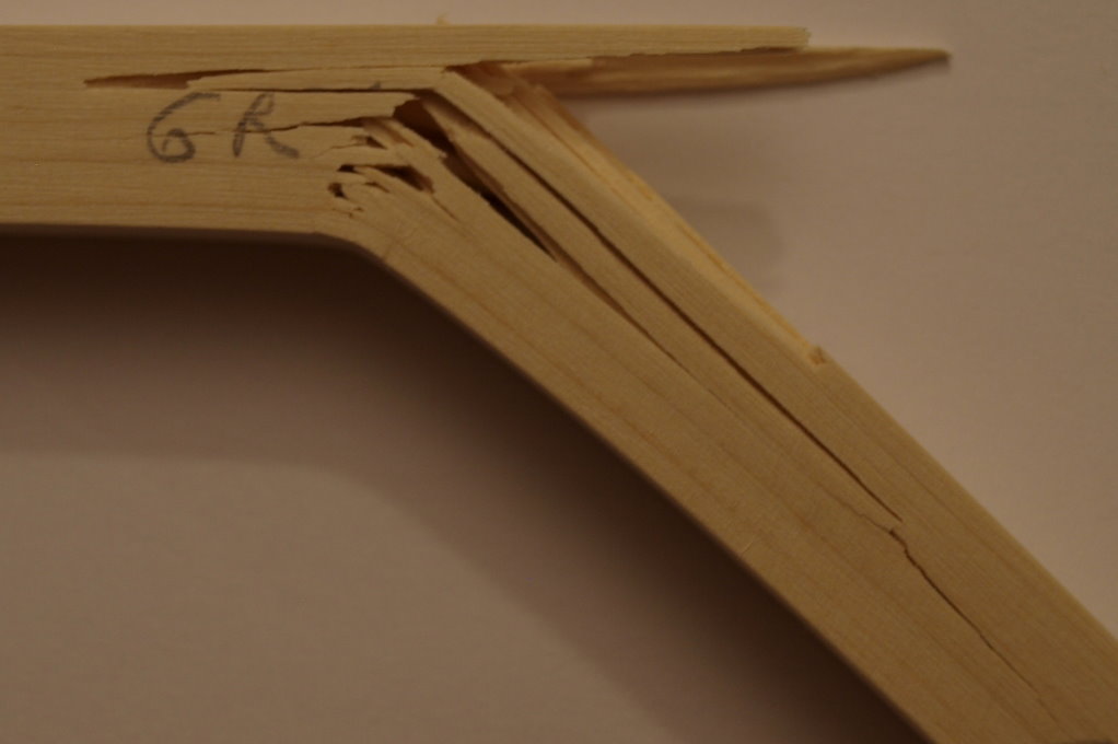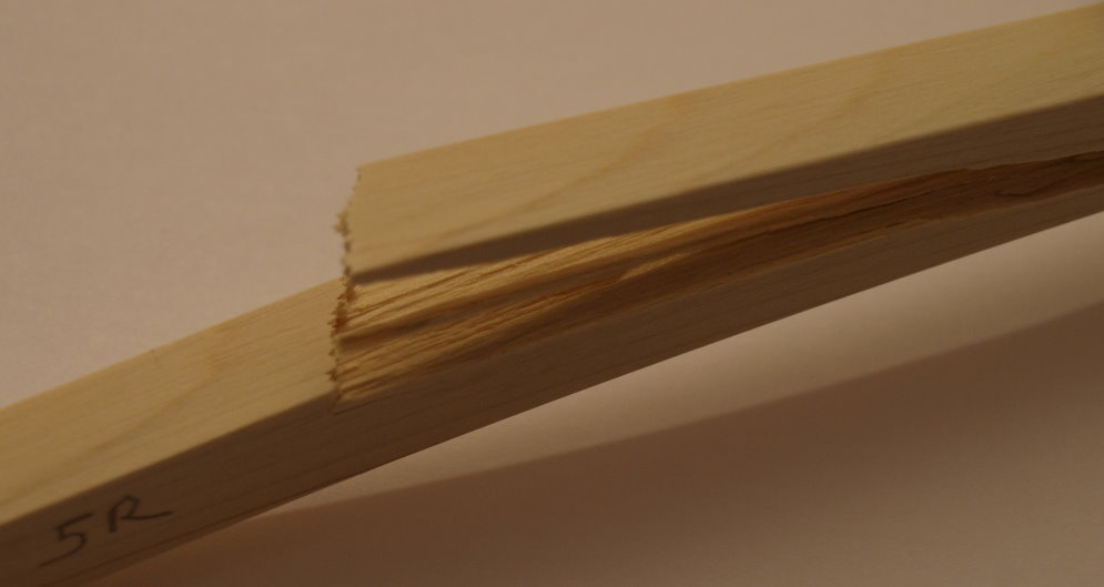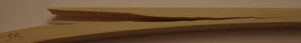 Der Bruchverlauf folgt im wesentlichen den Jahresringen, geht mitunter aber auch durch Ringe hindurch. Wie zum Beispiel beim Muster mit 6 Ringen mehrfach zu erkennen. Beim Muster mit 5 Ringen erfolgt sogar der Bruchansatz am Rücken quer durch einen Ring.