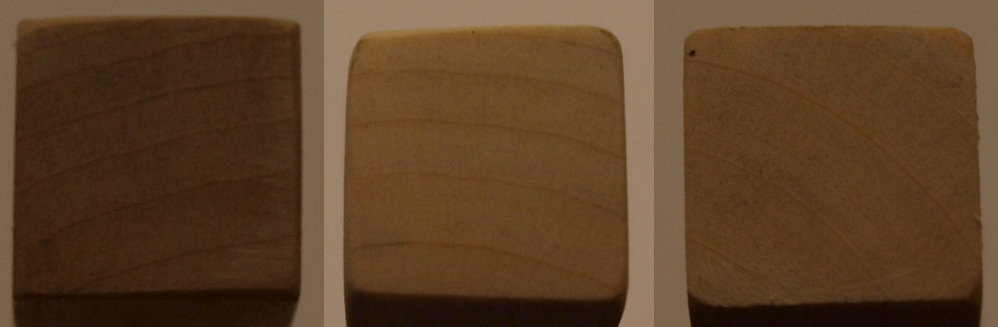 Geprüft wurden drei Muster: eines mit 6, eines mit 5 und eines mit 4 Jahresringen. Die 4 Jahresringe liegen diagonal.