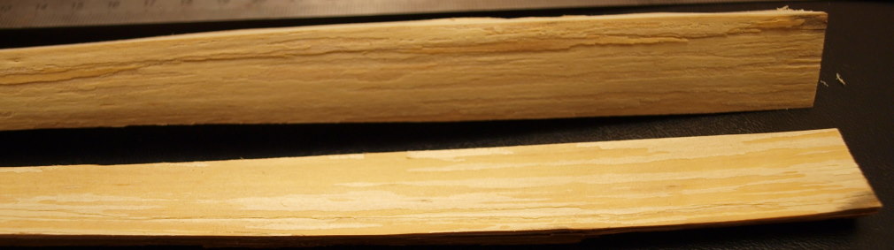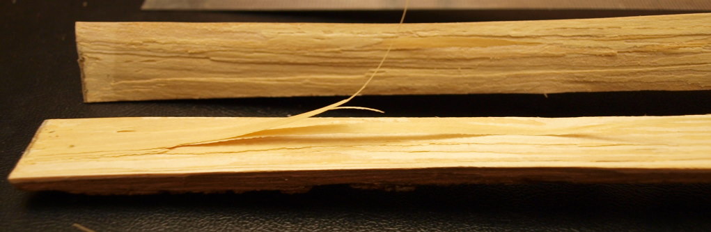 Am Bauch sind kaum Stauchspuren zu erkennen - speziell beim Prüfling mit 5 Jahresringen erscheint die Bauchseite nahezu unbeschadet - was mich zum Schluss führt, dass es sich um ein relativ (relativ zur Zugfestigkeit) druckfestes Holz handelt.