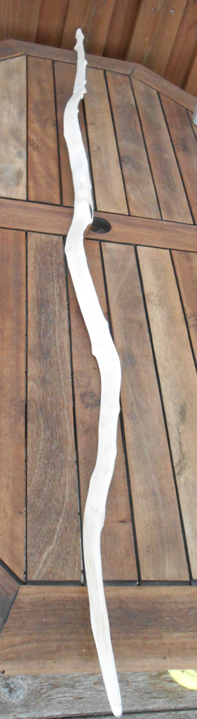 Die Pfeilanlage habe ich aus Horn ausgeschnitten und nach unten hin leicht angeschrägt. Danach wird die Form mit einem spitzen Bleistift auf den Griff übertragen. Dabei ist darauf zu achten, dass der untere, also der abgeschrägte Rand des Inlays übertragen wird. Damit lässt sich das Inlay besser versenken, weil immer noch ein wenig Spielraumvorhanden ist, falls man sich ein klein wenig verschneidet. Die angezeichnete Form wird dann mit einem scharfen Beitel oder Messer vorsichtig ausgehoben. Zwischendurch sollte man das Inlay immer wieder anpassen. Bei der ausgehobenen Form im Griffstück werden die Ränder ebenfalls angeschrägt. Mit ein klein wenig Geduld lässt sich das Inlay so nach und nach einpassen.Anschließend wird verklebt und verschiffen. Das Inlay ist nun vollständig eingepasst und plan verschiffen. Und so sieht er bis jetzt aus:Bei der unteren Nocke musste ich das Overlay bis ans Astloch ranziehen, weil mir bei der Bearbeitung des Astloches ein Rückenspan weggerissen ist. Hat zwar bei der Bearbeitung und beim Tillern keine Probleme verursacht, aber sicher ist sicher.Heute werde ich wohl, als letzte Arbeiten, den Bogen mit Schellack und dann mit Leinöl versiegeln und noch eine Sehne klöppeln.