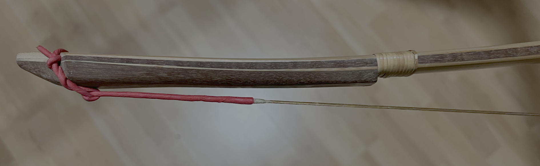 Kannst Du, abgesehen vom Iriki, die Form des Bogens beurteilen? Befinden sich beide Enden in der Flucht? Ist der Abstand der Sehne zum oberen Klangholz ok?