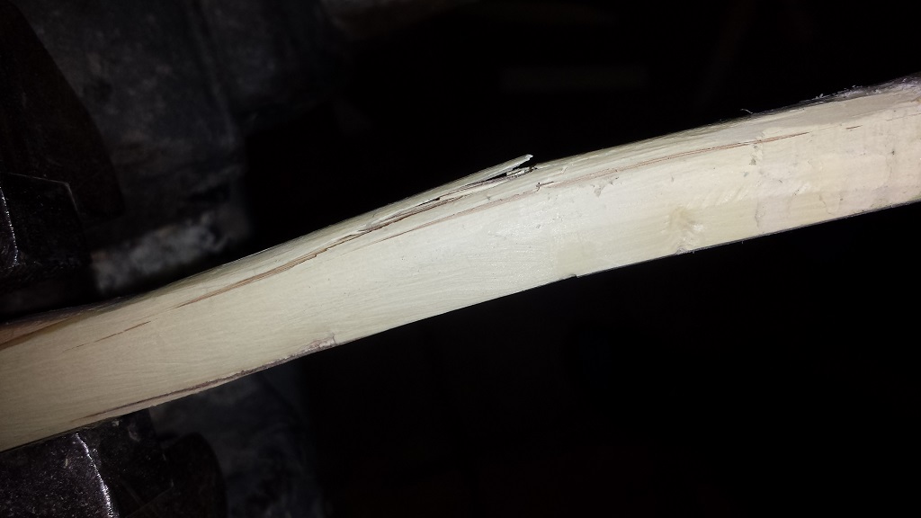 Ich habe den Bogen danach einfach so lange ausgezogen bis er gebrochen ist um zu sehen wo er bricht. Der Bruch fand in den leicht angedeuteten Needles statt.