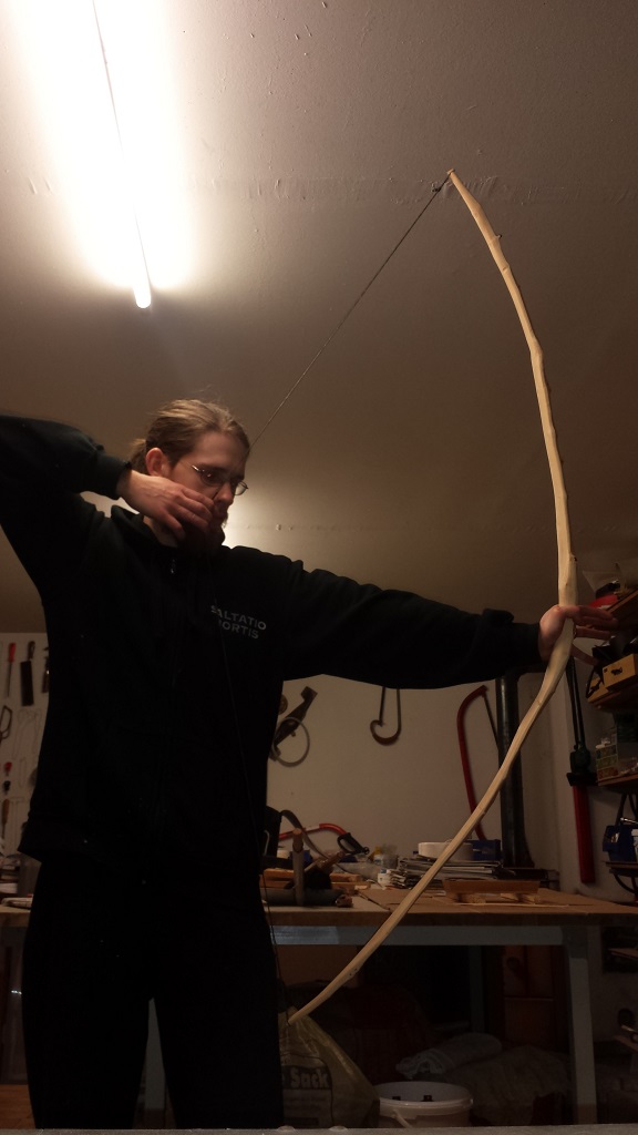 Der Bogen ist mitlerweile geschliffen und die erste Schicht Hartöl ist drauf. Getillert hab ich haupstächlich über die Schulter. Da mein Tillerbaum keine Umlenkrollen hat habe ich diese Variante gewählt.
