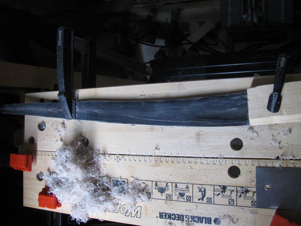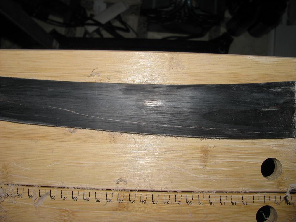 Oh Mann, ich arbeite schon seit einiger Zeit an den Hornstreifen. Einer der Streifen war zugleich seitlich und schräg verdreht. Nach einigem Wasserdampf und Heißluft habe ich ihn jetzt soweit, dass ich einen geraden Streifen für den ersten Wurfarm herausschneiden kann.