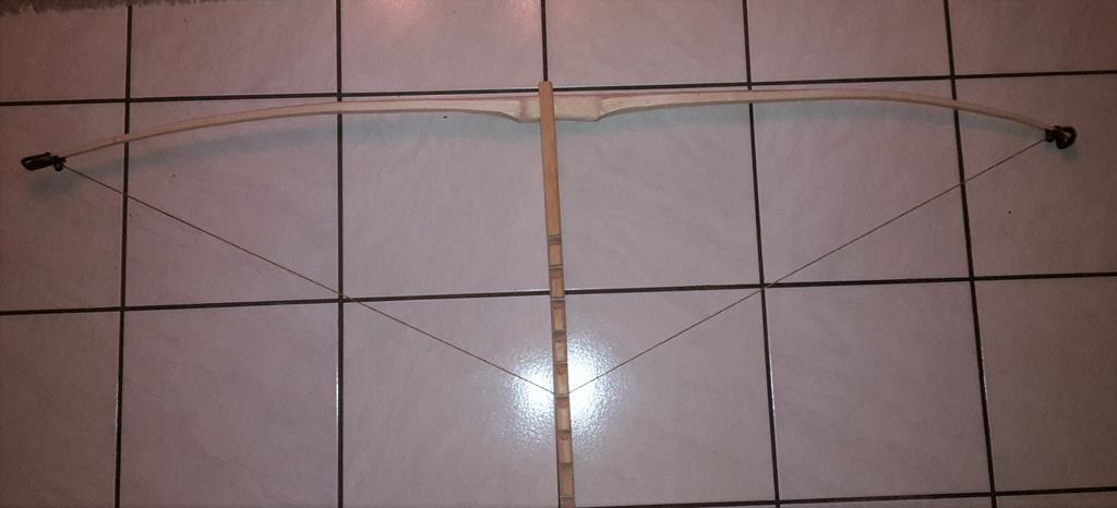 Ich habe noch ein paar Bilder gemacht, die Länge ist 1,69m. Der Bogenrücken ist rund, der Bauch ist rechteckig. Am Griff ist der Wurfarm ca. 4 cm breit das Ende ist 2 cm breit.