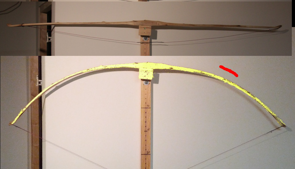 Am Sonntagmorgen sah der Bogen dann nach dem Aufspannen ziemlich schräg auf, hab noch etwas mit der Ziehklinge am unteren Arm gekratzt, dann bin ich aufs Turnier gegangen, obwohl der untere Wurfarm noch zu stark war. (knapp 1 cm mehr Sehnenabstand am oberen WA). Mit der "Fastflight" Sehne (6 Strang BCY 452x) und Bambuspfeilen (347 gn) mit leichter Spitze (30 gn) und 4 Zoll Saubuckel Federn kam ich dann ca. 30 Schritte übers Clout (stand bei 165m) hinaus. Das hat auch konsistent über alle 12 Passen a 6 Pfeilen funktioniert. Die Pfeile kamen allerdings nicht sauber hinaus, sondern haben die halbe Flugbahn gewedelt, der Spine stimmte wohl nicht so ganz. Leider ist mir ein Bambuspfeil beim Putzen im Gras (!) zerbrochen