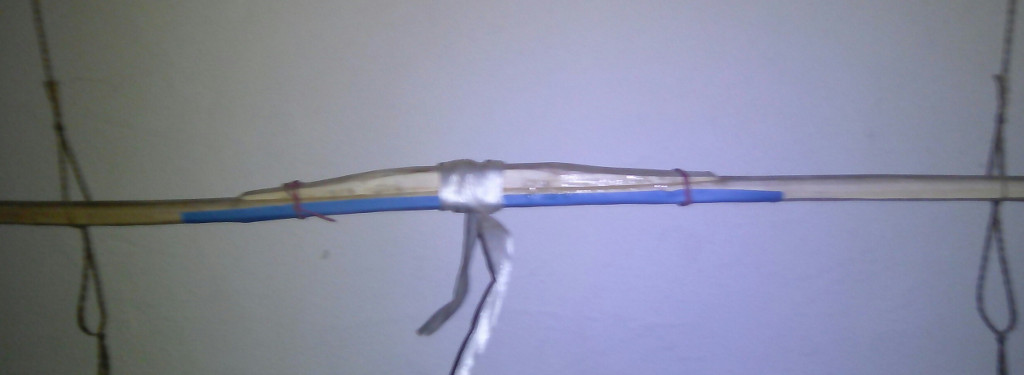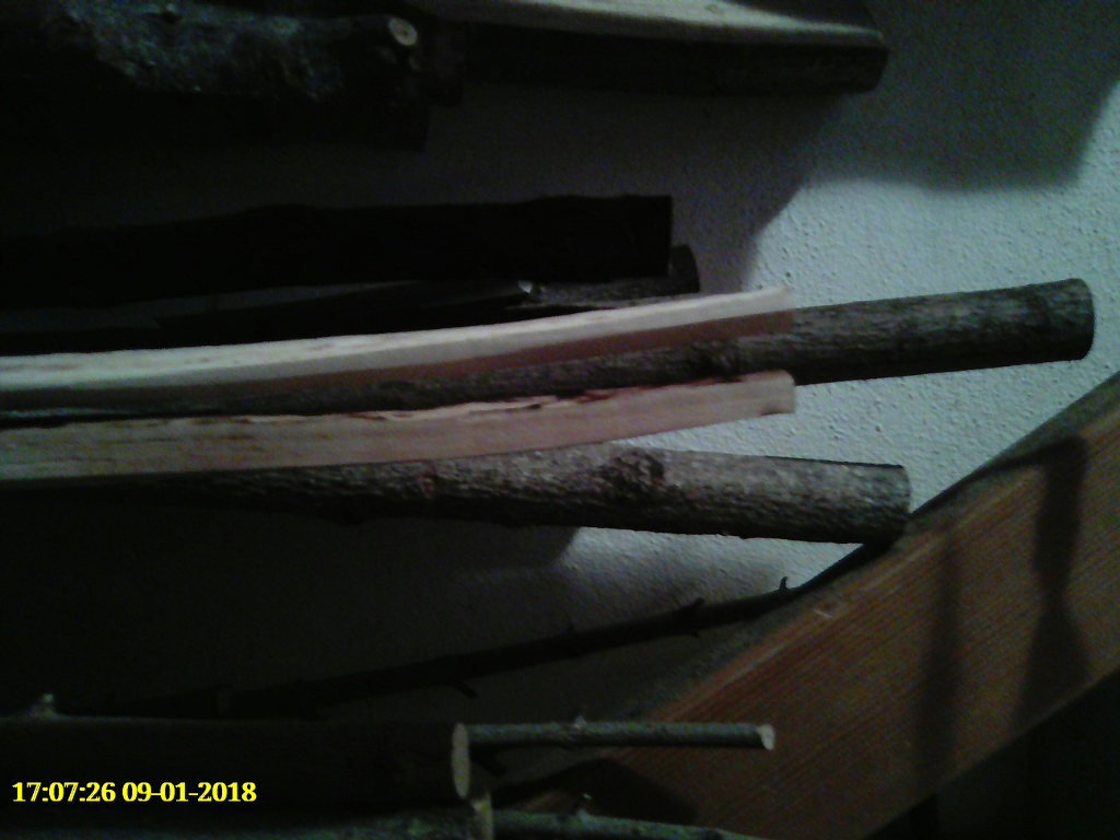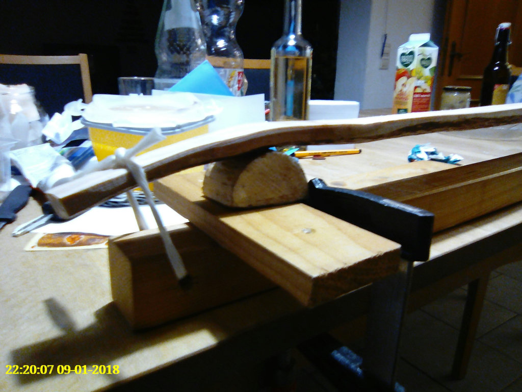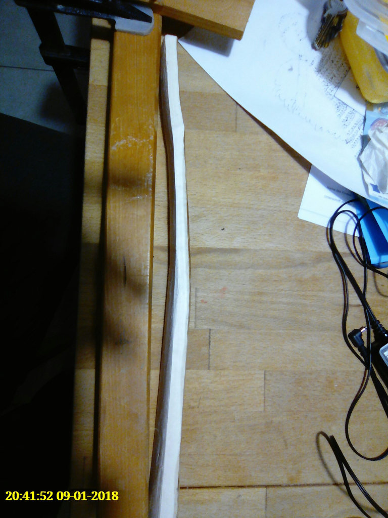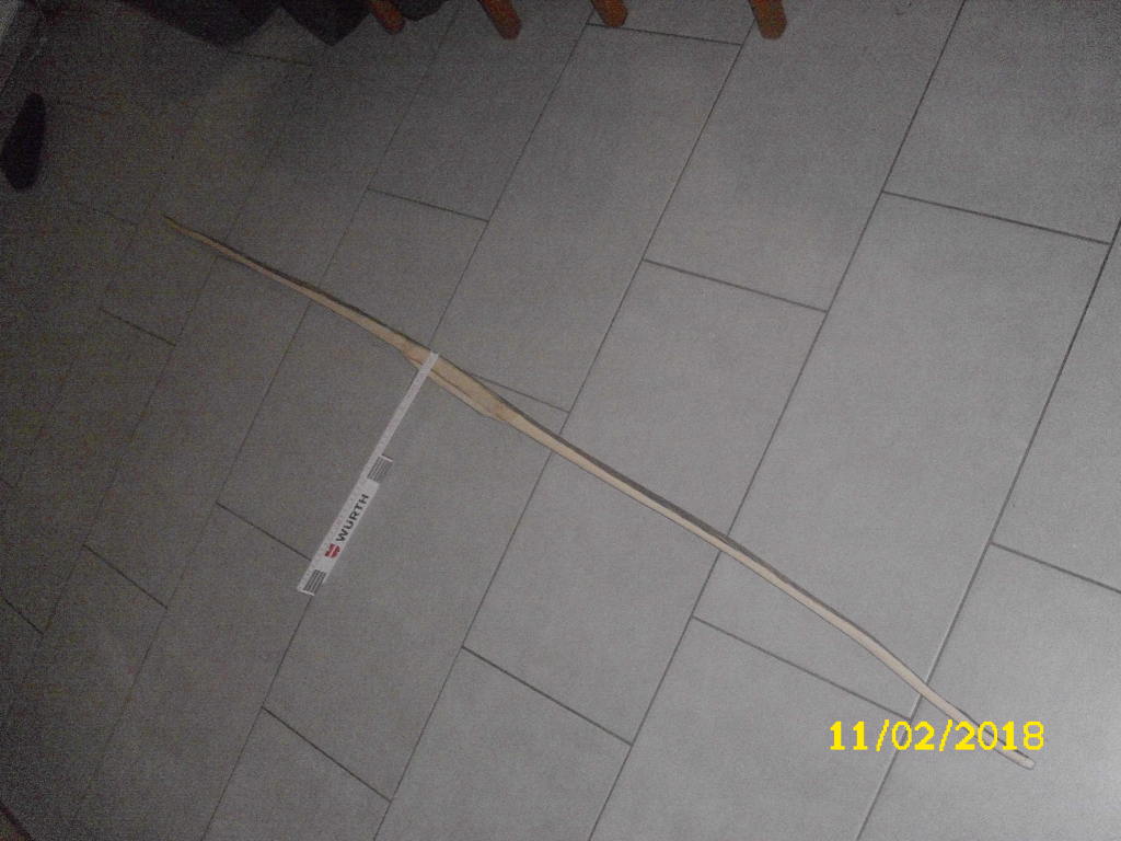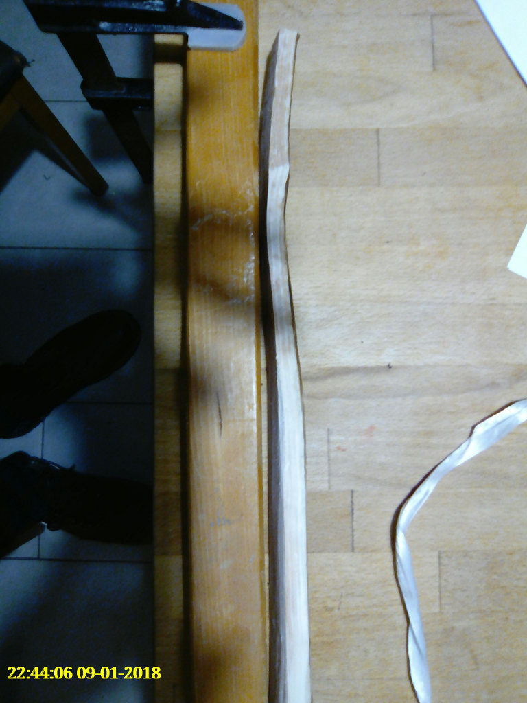 Die Ausgangssituation-- an den Enden hat PlanB Reflexe, PlanA aber Deflexe. Hier mal die beiden Enden von PlanA, nicht berauschend photographiert, aber das wesentliche sollte erkennbar sein. Das Kochen im Spargeltopf, die Zeiten sind am Bildrand ersichtlich,gesamte Kochzeit ca.1,5 Stunden. Das Biegebild entstand erst etwas nach dem Biegen... ca ne halbe Stunde später. Und so sah es heute aus,ich hab PlanB mit dem gleichen Ende einfach draufgelegt.Wohlgemerkt: es sin halbwegs symmetrische Spaltlinge, also vorher quasi Spiegelbilder. Was hier nach wenig aussieht, sind in Wirklichkeit ca 6,5 cm Flip, von Deflex nach Reflex.. Die Biegezone lass ich im späteren Bogen einfach steif, dann sind die Chancen gut,das sie auch bei etwas Zurückkriechen wenigstens gerade bleibt. Der etwas bösere Fall, aber zumindest mit einem kleinen Aufschwung am Ende. Das ist übrigens der Teil, den ich an PlanB gekürzt habe, um den "Abschwung" aka Deflex zu vermeiden. Außerdem wär der mit 190cm Länge wohl eher ne schlappe Nudel.