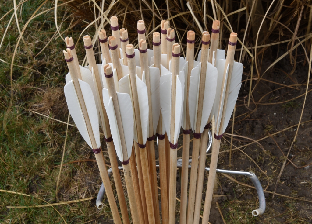 hat ein Gewicht von 58g(895grain) Spine haben sie alle zwischen 90 und 95#. Die Pfeile mit den 4 Blatt Spitzen sind ein Probelauf für den Ägypter. Da ich nicht wusste ob sie was werden und alles passt, sind sie etwas schlichter gehalten. Von dem Pfeil mit dem Instant Tudor Bodkin gibt es 6 weitere. Da ich nicht wusste ob die Spitzen wirklich was sind habe ich erst einen Pfeil davon fertig gemacht und nicht großartig bemalt. Bisher machen der Instant Tudor Bodkin eine gute Figur.