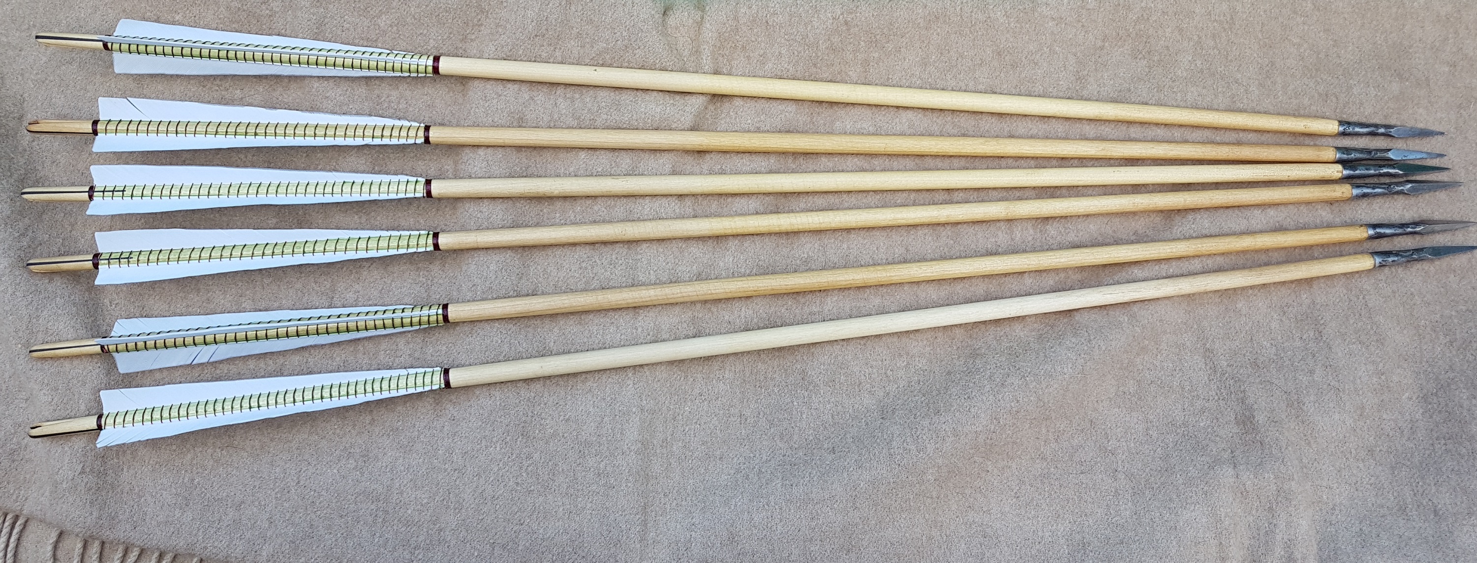 So die erste 6 Pfeile sind fertig und getestet. Sie fliegen gut und passen besser zum Trilaminat Bogen als die Assyrer Pfeile. Die Pfeile sind 32'' Lang , die Pfeile mit den 4 Blatt spitzen haben eine Gewicht von 56g(864grain) und der mit der Instant Tudor Bodkin
