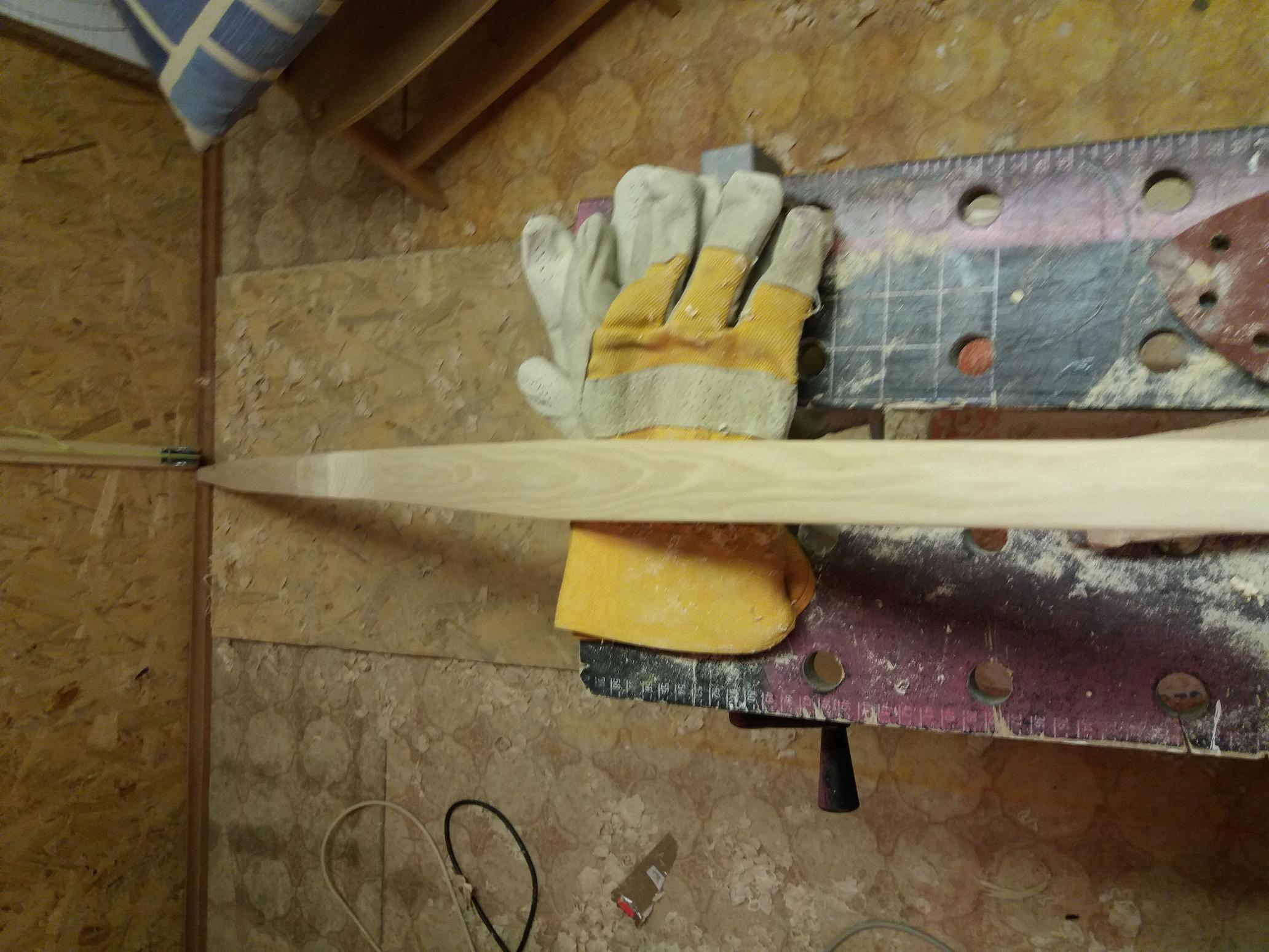 Den Griff würde ich noch etwas breiter lassen, so dass er auf den Tillerstock passt (bei mir sind das 3 cm), die endgültige Griffausformung erst wenn du auf Standhöhe bist und weist welcher WA oben oder unten ist (Sehnenlage korrigierbar).