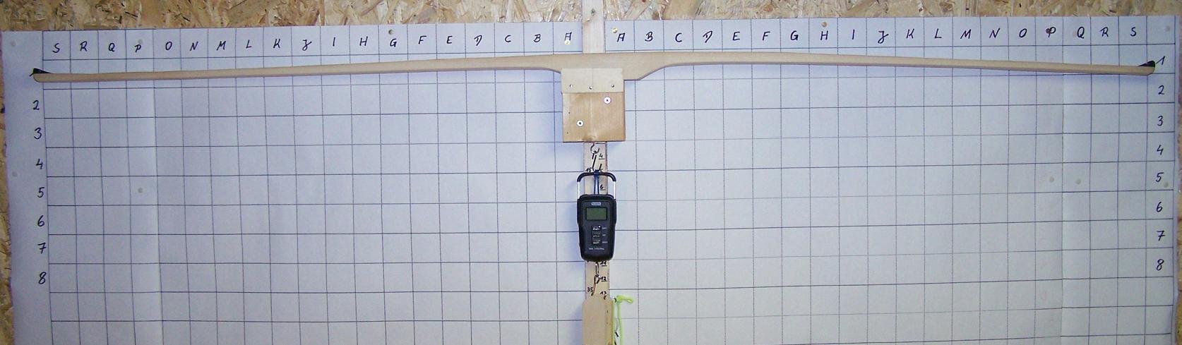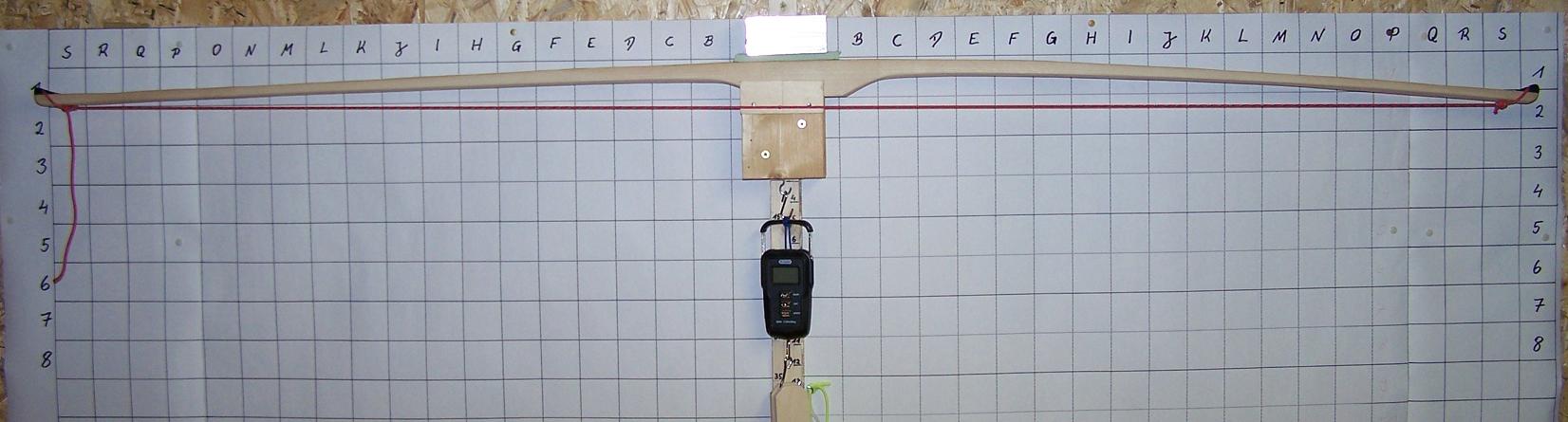 Bei 28" Auszug hast du reale 22" was du den Bogen ausziehst (6" sind Standhoehe). Damit kaemst du wenn der Bogen schon fertig waere auf ca 46# @ 28" (27.5# / 13" * 22"). Da geht natuerlich noch was weg, jenachdem wie gut der Tiller schon ist und wieviele Fehler du noch machst.