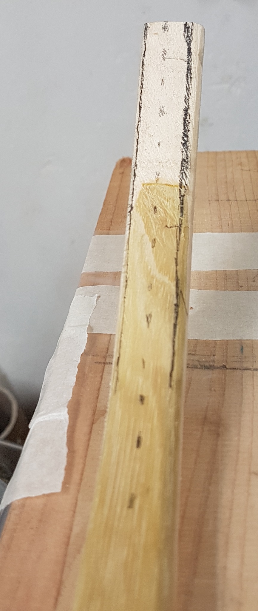 Dann die Bauchrundung an diversen Stellen mit einer Raspel korrigiert und mit Ziehklingen abgezogen und nach jeweiliger Ansicht auf der Tillerwand 3x nachgeschabt. Dann noch die Lage der Siyayhs gecheckt, da hatte ich entweder etwas schief geklebt oder der Bogen hatte sich etwas verzogen. Aber das ist kein Problem - die Dinger sind eh noch deutlich zu breit.