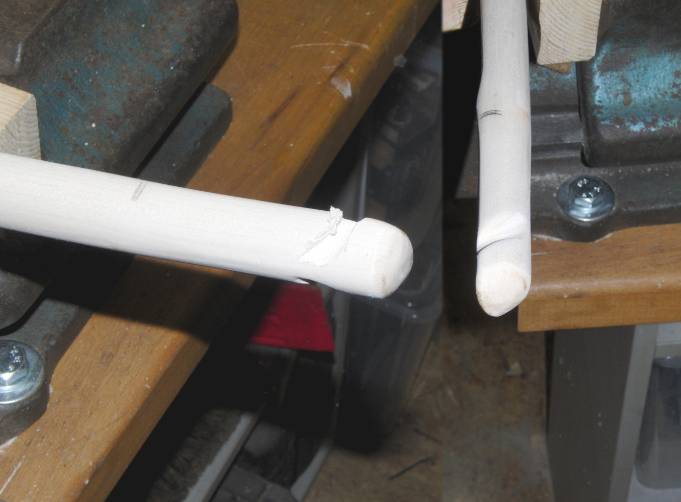 Endlich (nicht das Ende des Bauprozesses) habe ich mich durchgerungen, die provisorischen Nockkerben zu verfeinern, um die Wurfarmenden auf ihre endgültigen Maße zu bringen (wahrscheinlich würde der Fortgeschrittene Bogner hier noch Potential zur Leistungssteigerung sehen - oder auch nicht, bei dem Verhunzungsgrad).