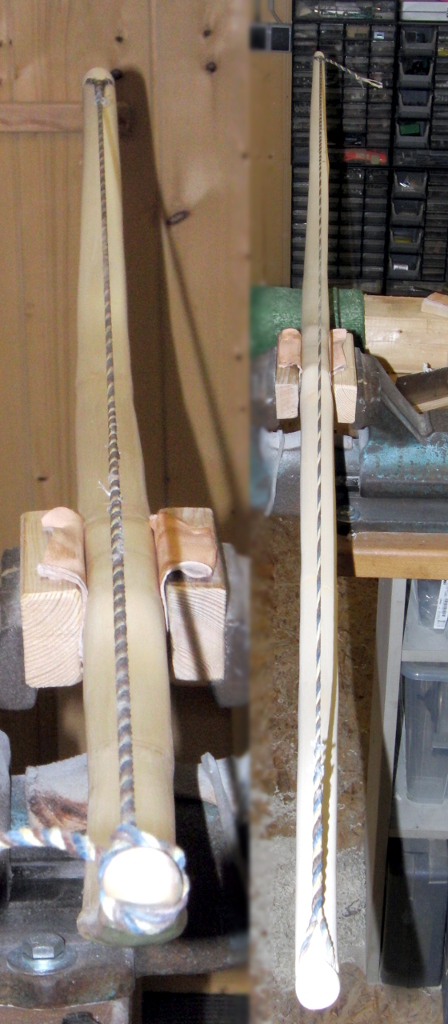 Bei der weiteren Bearbeitung des Staves haben sich die vormals mutmaßlich zu eliminierenden Fehlstellen in Wohlgefallen aufgelöst, da die genannten Stellen noch genug Material hatten. Ich hoffe, bei der Aktion keine Schwachstellen eingebaut zu haben. Also habe ich den anhänglichen Waldbewohner wieder eingepackt und ohne Epoxid und Amin weitergeschafft.