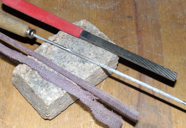 Mit Waage, Raspeln, Ziehlkinge, Schmirgel Körnungen 120 und 150 Tillerwand und dem nicht abgebildeten Schraubstock habe ich