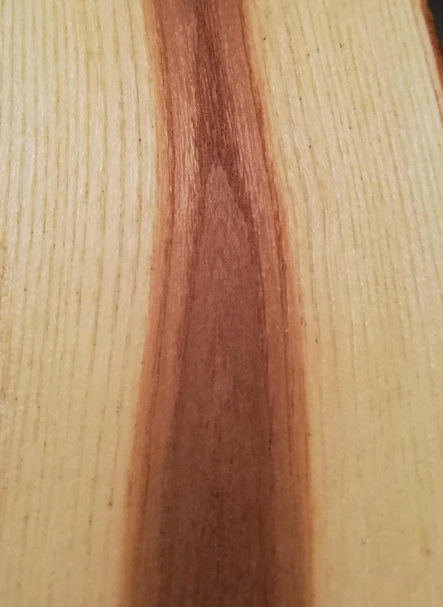 Außen ist es durch Witterung stärker eingefärbt, innen noch nicht. Ein bischen im Regen liegen lassen, dann kommt die Einfärbung vom Kern.