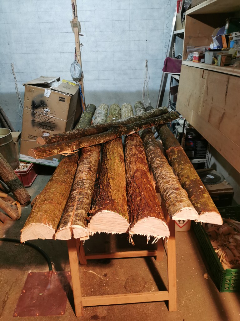 So nun habe ich 5h Holz gespalten gesägt und entrindet... für heute reichts. Es ist noch eine Robinie dazu gekommen, da warten 10 Staves, dass sie vom Splint befreit werden...