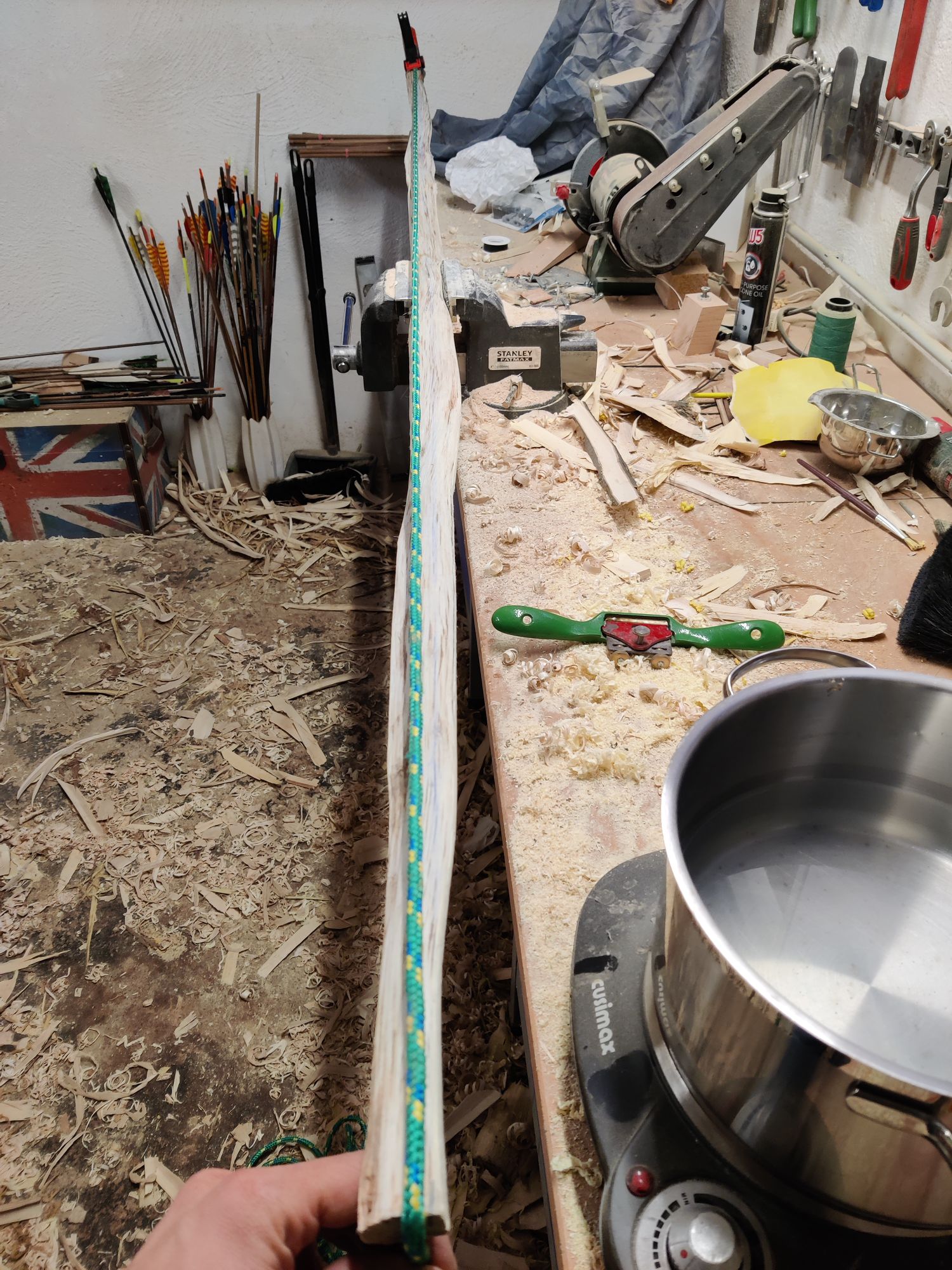 Dann hab ich ihn noch mit dem Schweifhobel etwas in Form gebracht. Ich will daraus einen Langbogen mit schmalem Griff und Ellipsenförmigem Wurfarmquerschnitt machen. Ich hab ihn dann erstmals gewogen. Liegt zur Zeit noch bei 1030g. Da der Bogenrücken an einem Wurfarm im Fadeout zur Seite kippt hab ich ihn dann noch gedämpft und am Tisch niedergespannt.