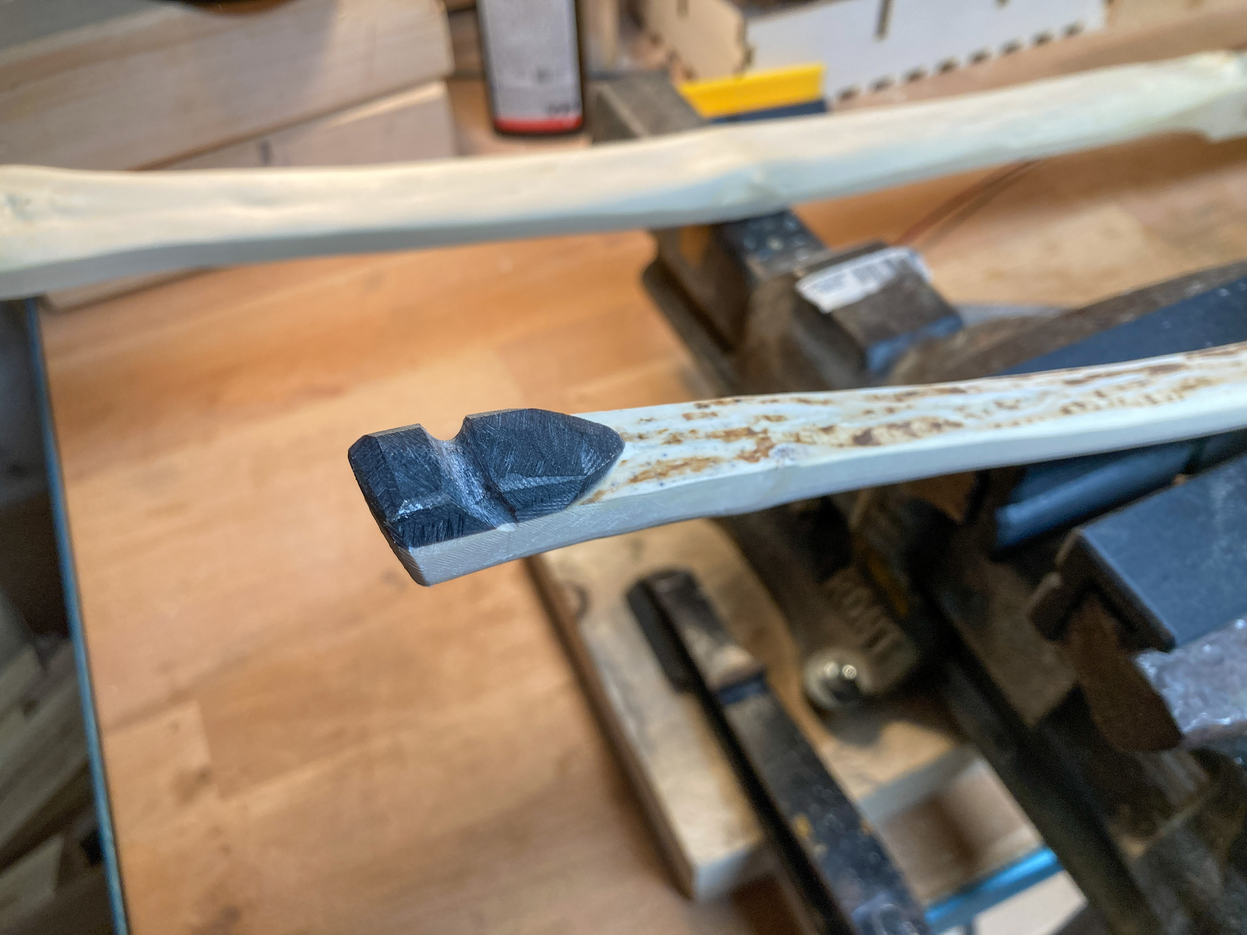 Da der Markkanal im Holler nicht mittig verläuft ist der Griff einseitig sehr dünn geworden und ich habe ein Stück Robinie eingeklebt - davon gibt es nur noch kein Foto, später hoffentlich mehr.