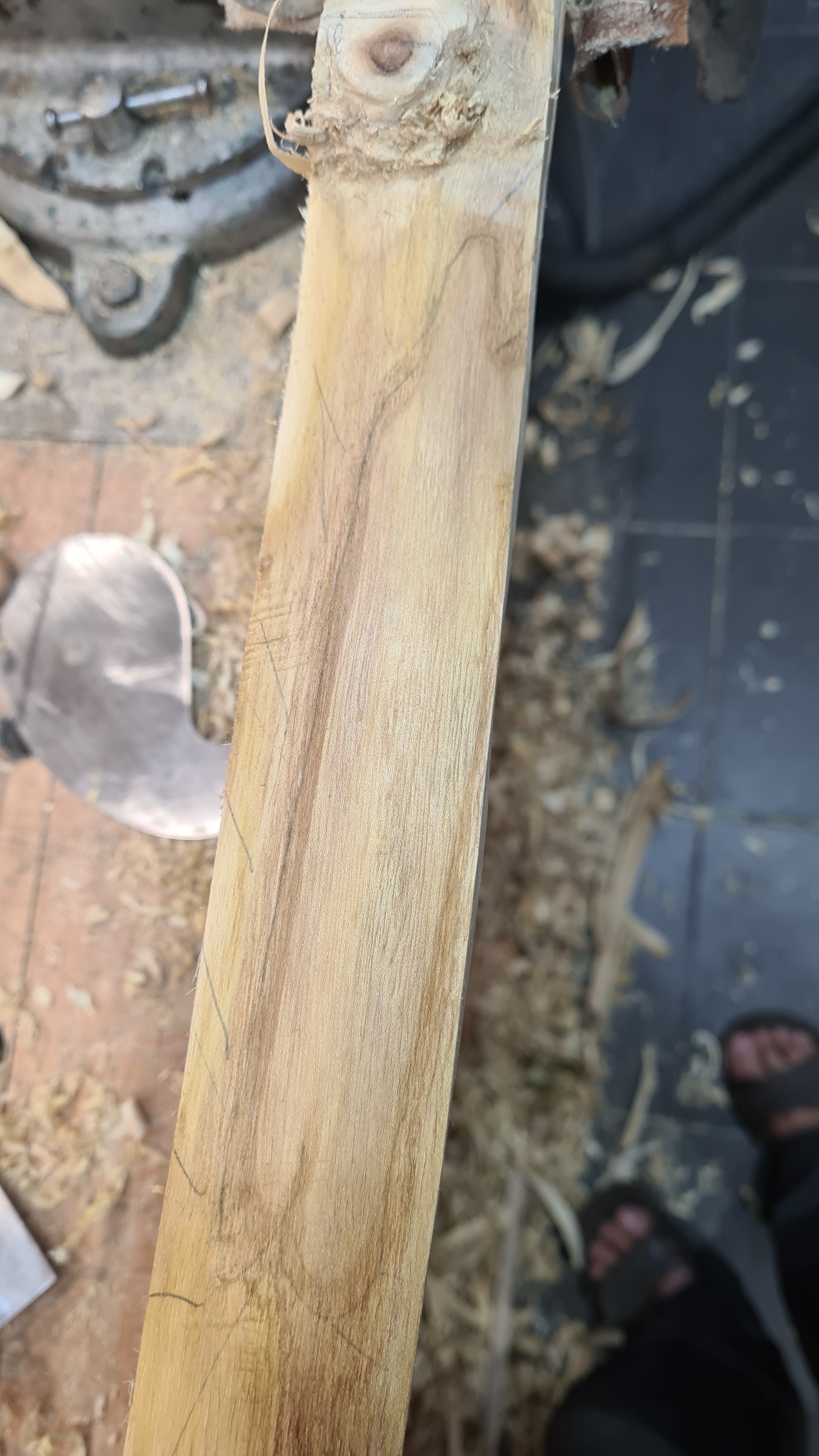 Ich müsste das live sehen, um mir sicher zu sein, aber es sieht so aus, als köööönnte es sein, dass du teils in die Fasern des Spätholzes reingeschnippelt hast. Das würde auch die Rückenbrüche erklären. Von irgendwo 50+ Robinienbögen is mir noch nie einer über den Rücken gestorben. Hier mal bei ein paar Stellen eingezeichnet, was ich meine: